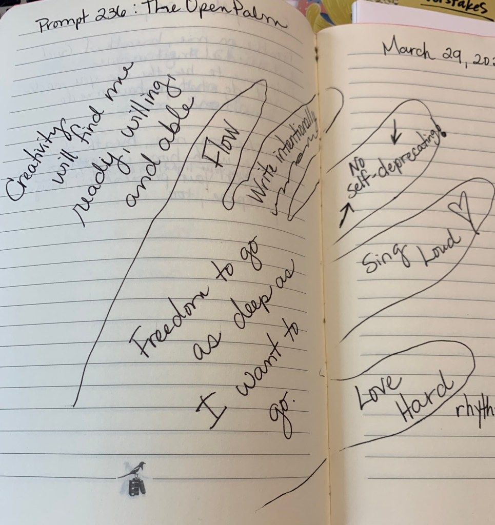 - Write a creative intention inside your palm. Around it, begin writing things that will invite you back to your practice—encouraging words, activities that inspire you, different ways of approaching your intention, small steps to get you closer to your goal.