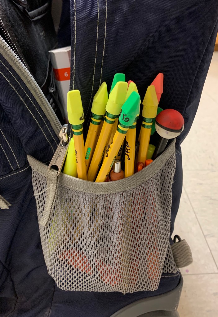 Back to school after winter break I noticed my student’s backpack and his surfeit supply of pencils and clean, pointy eraser heads. He was prepared! I’m not sure this arrangement with his initials on each pencil and eraser was done by him, his mother, or his grandmother, but it made me chuckle and think back to the days of raising my children. They were lucky to find clean clothes to wear.
