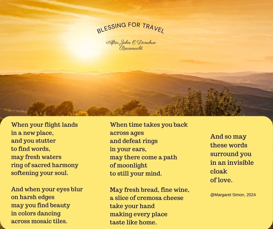 Margaret, what a beautiful channel for your travel envy–to give a travel blessing to others. It is a beautiful step toward wholeness for you and the whole world. There are so many meaningful images–the taste of home, “moonlight to still your mind”, and “colors dancing” to mention a few favorites. Lovely. I hope your husband continues his speedy healing, and here’s to a future trip coming soon.
