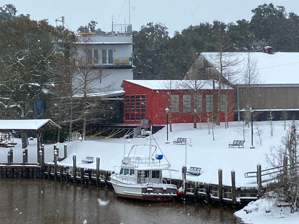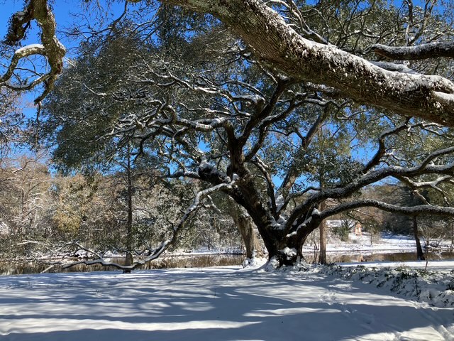 As snow layers over green, dim light shines on bayou brown. Will snow return in a hundred years? “This snow is awesome!”