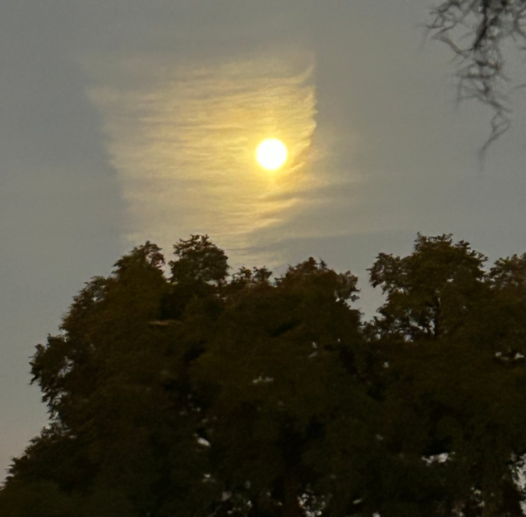 The full moon greeted me on a frigid morning this week. I don’t think Iphones are great at taking moon photos. This photo with its automatic longer exposure blurred the cloud cover creating an interesting effect, don’t you think? I know I’ve featured moon photos here often. Like ocean view photos, I never tire of the peaceful feeling of a full moon, especially the bright light on a cold morning.