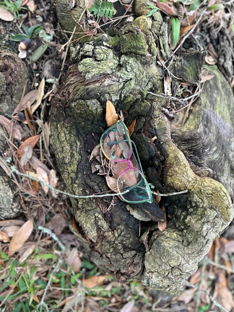 We haven’t had snow here in south Louisiana, but today on my walk I found a wooly glove missing its owner and these glasses that look like they were intentionally set into the oak tree root. Should I start collecting these items for the possibility of a snowman? Does the tree root have eyes to see? Some deep wisdom?