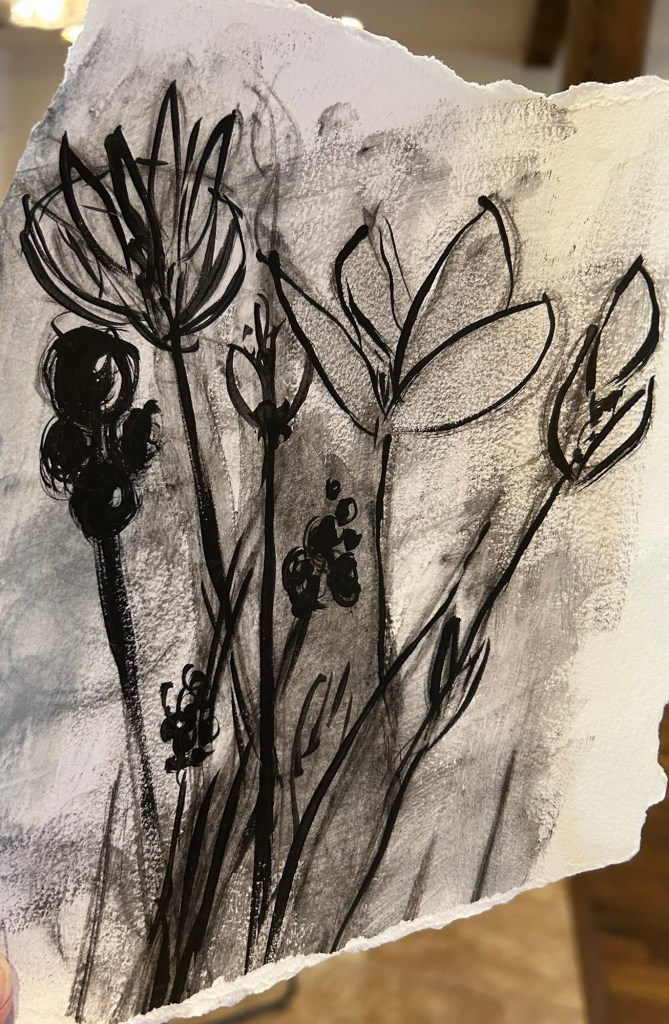 This art piece was lying on my sister’s kitchen counter. I picked it up and asked her about it. She said she found some charred wood outside from her outdoor fireplace and experimented with it. She then came inside and added more definition to the flowers with ink. She titled the piece “Out of Ashes.”