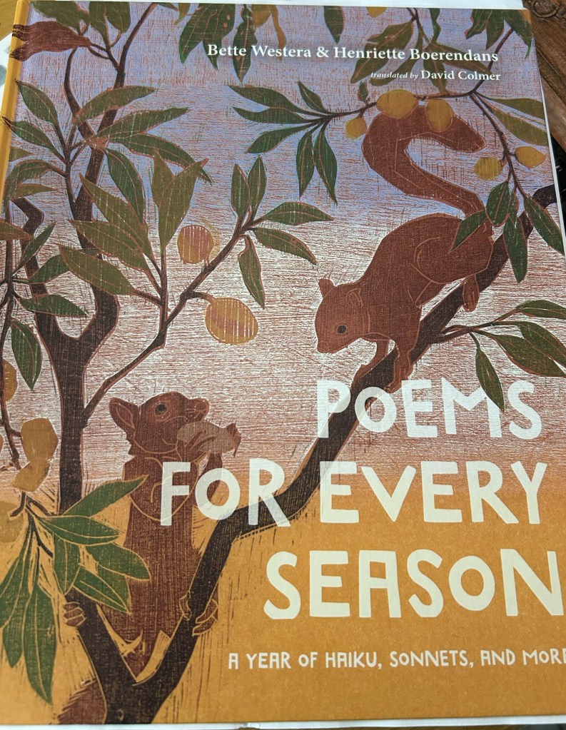 Poems for Every Season: A Year of Haiku, Sonnets, and More by Bette Westera offers a number of different poetry forms translated by David Colmer. Each page is a comforting woodcut design by Henriette Boerendans.