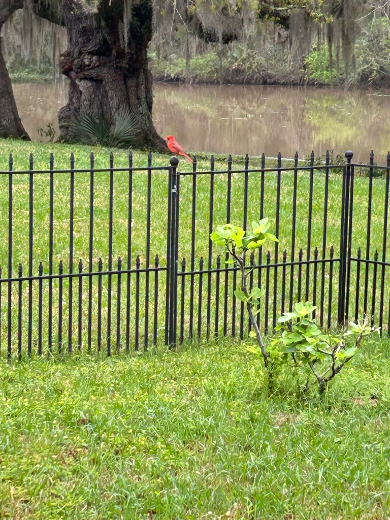 This photo I took of a visiting cardinal. As the day’s news gets more and more tragic, I turn to nature. Some southerners believe that when you see a red bird, you are visited by a lost loved one.