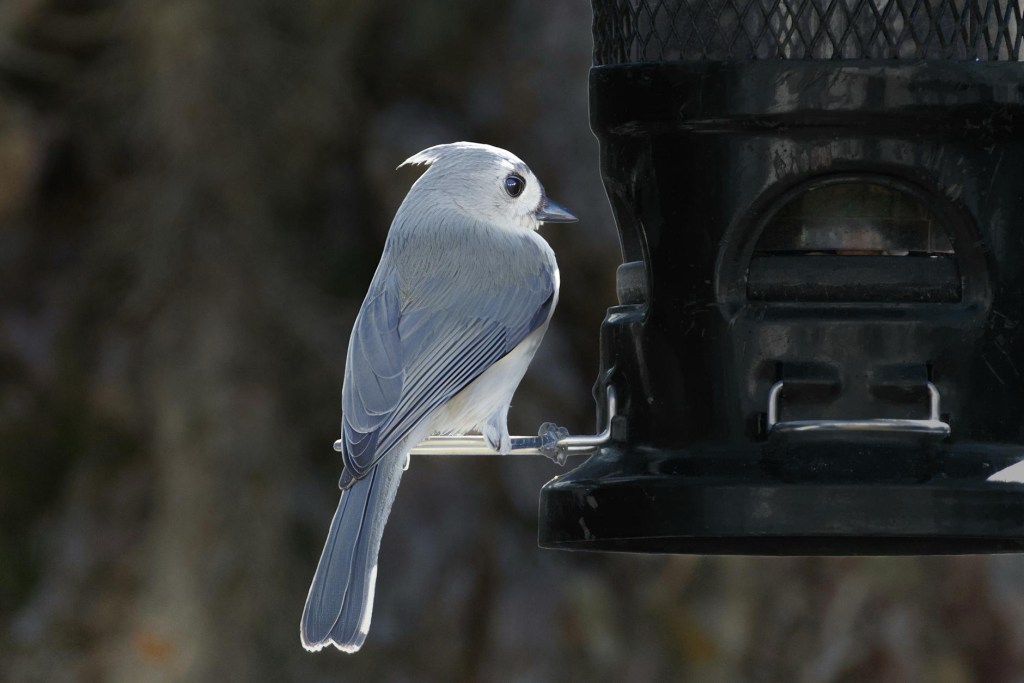 Currently, tufted titmouse bows into the feeder flicking seeds to the cardinal below.
