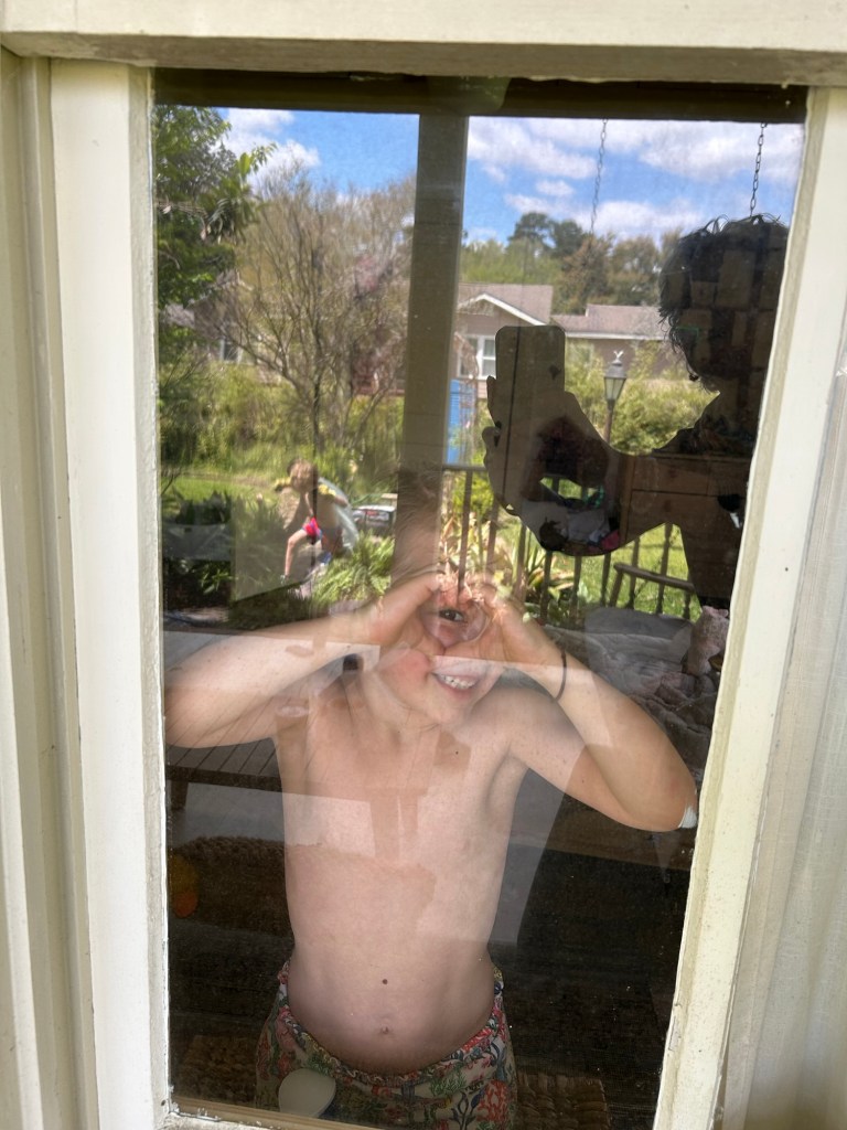 There’s a lot going on in the photo today. It’s not a great shot, but I love it for the action it conveys. I’m the shadow taking the photo. Stella, age 5, is showing me a heart through the glass. In the background, in typical fashion, Leo, age 7, is leaping. He was outside with his father helping with yard work (note the too big garden gloves.)