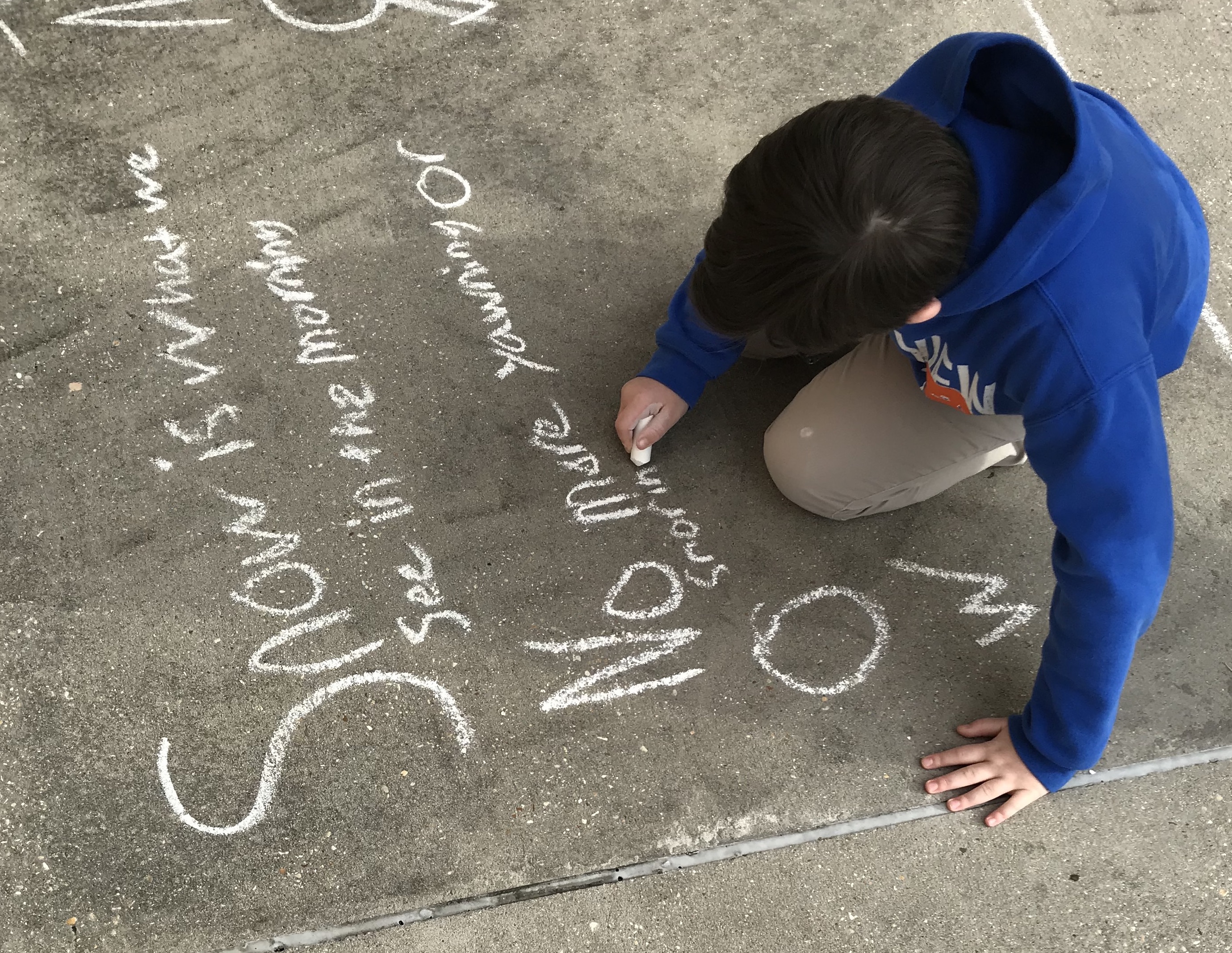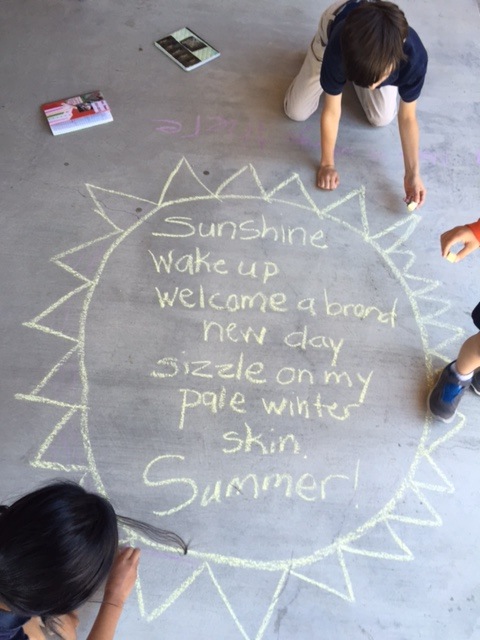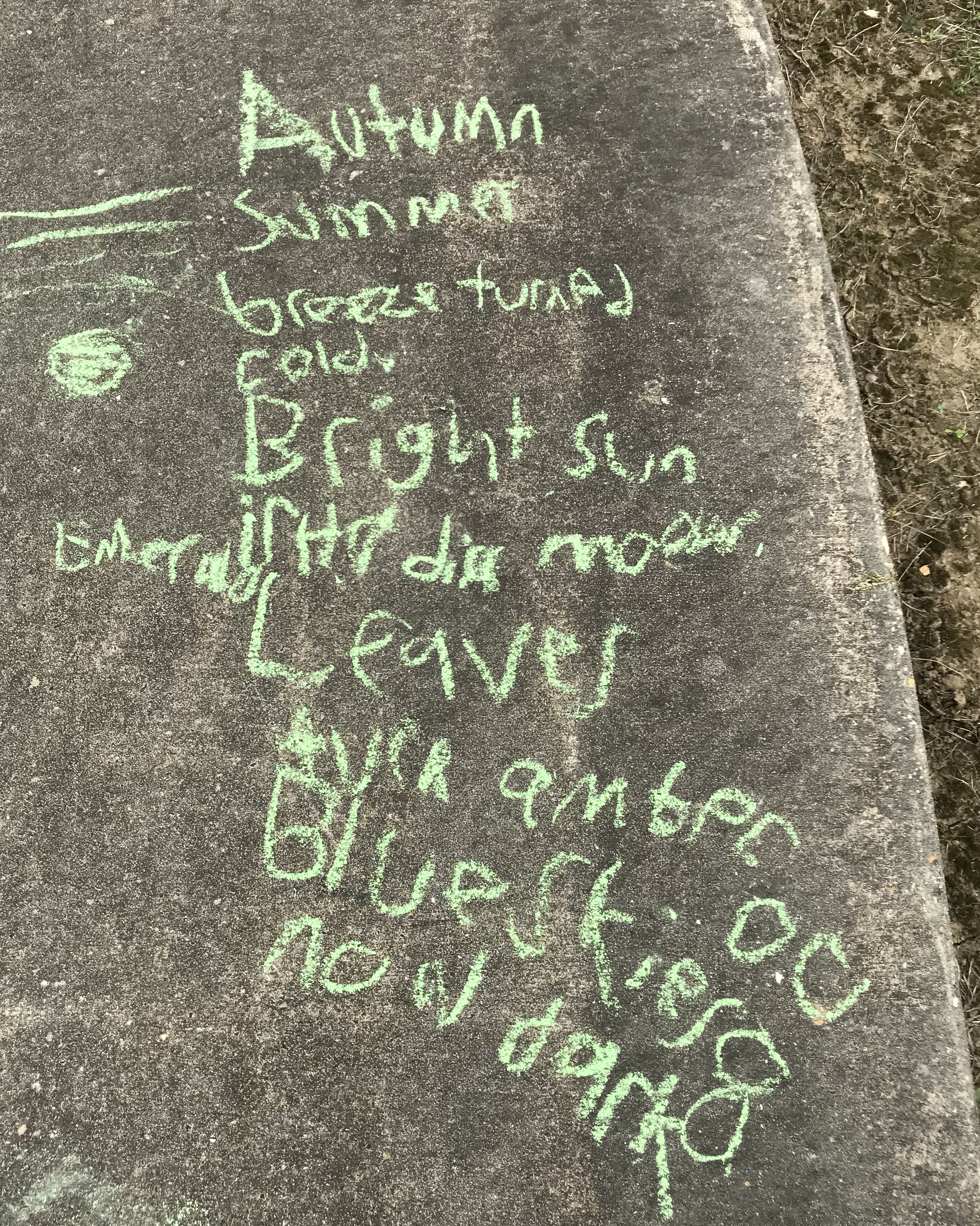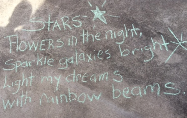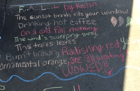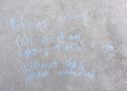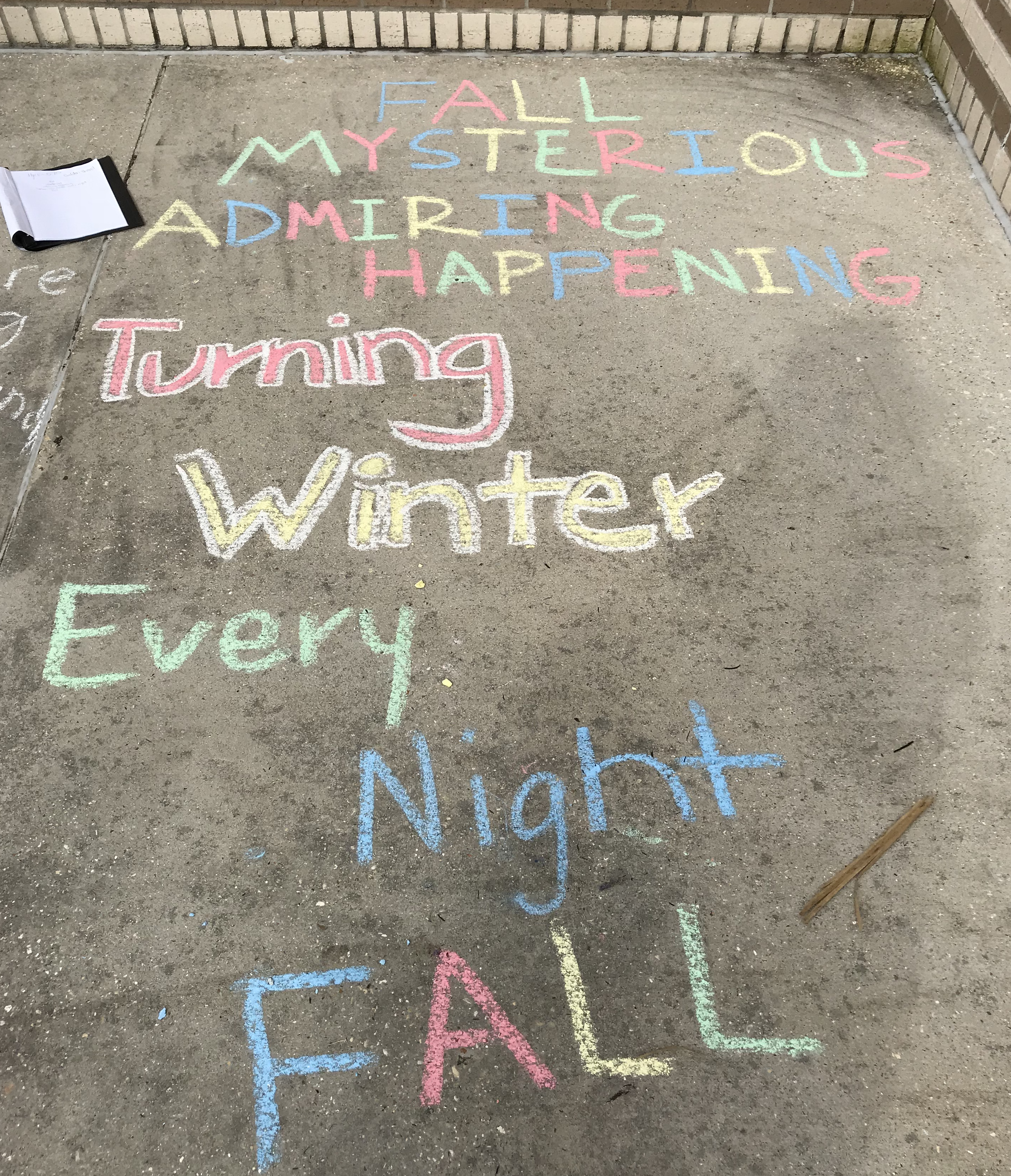 Sometimes, my kids blow me away with their poetry. Austin was not willing to share in the classroom, but he did chalk his poem. Austin’s been reading books by Jason Reynolds. I feel like he channeled Jason in his poem.