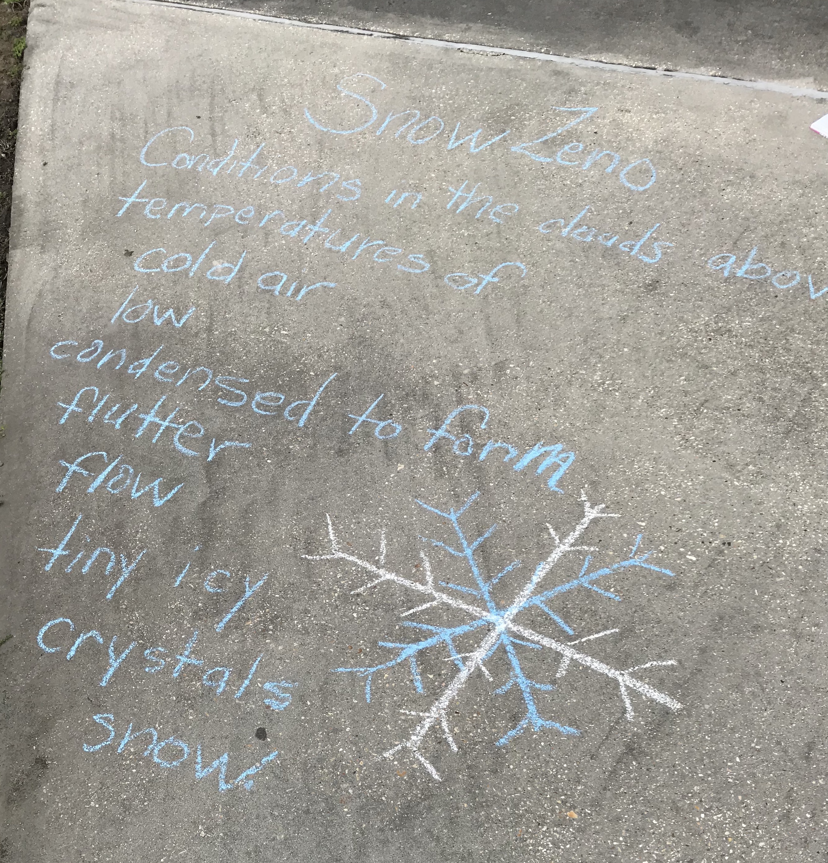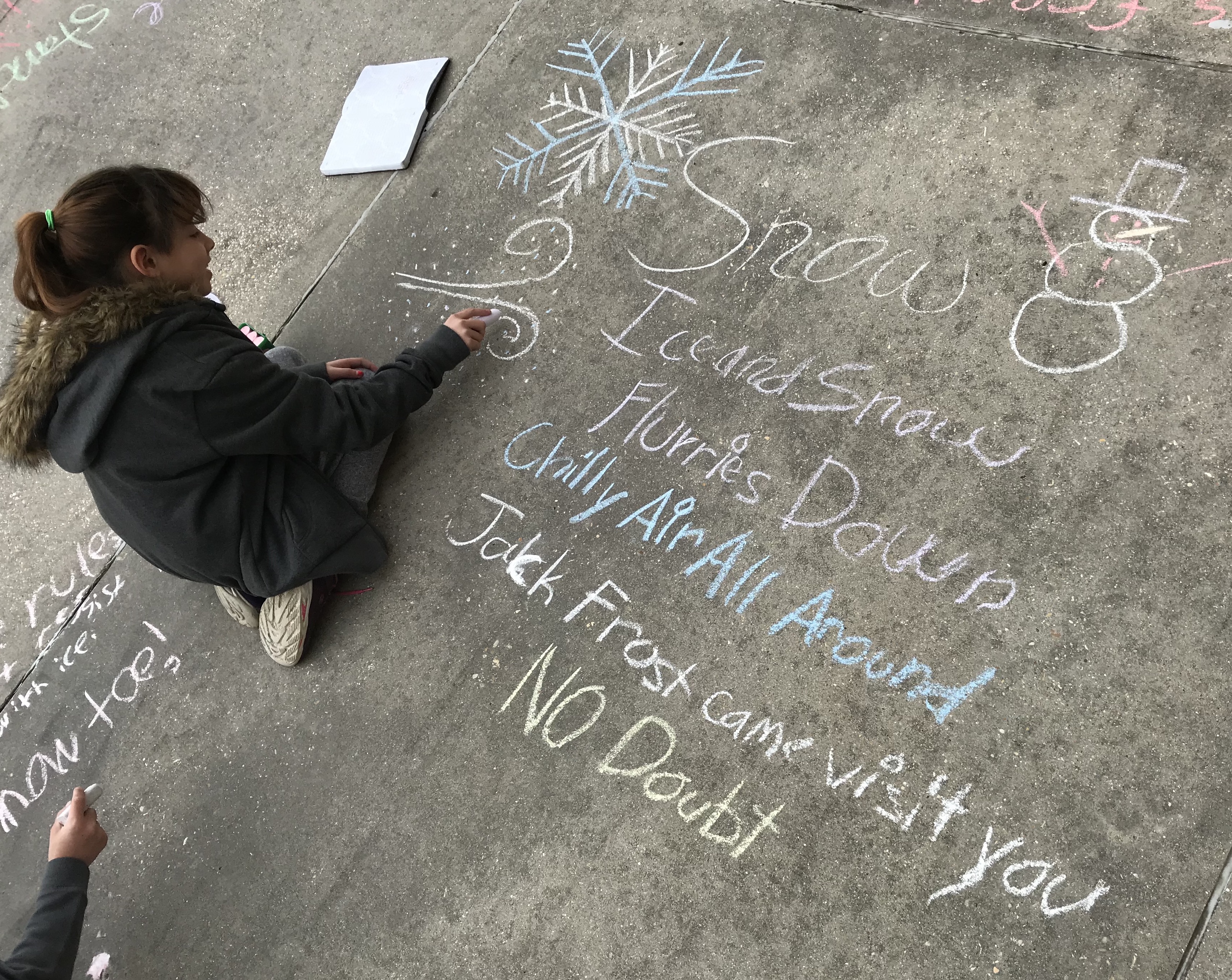 In order to have a chalkabration, we have to write small poems. I put 5 different form choices on the board: haiku, 15 words or less, zeno, cinquain, diamante, and acrostic. The topic, of course, was ice and snow since we returned this week from a week hiatus due to an ice storm. More than ever before, my students had the experience needed to write about this topic.