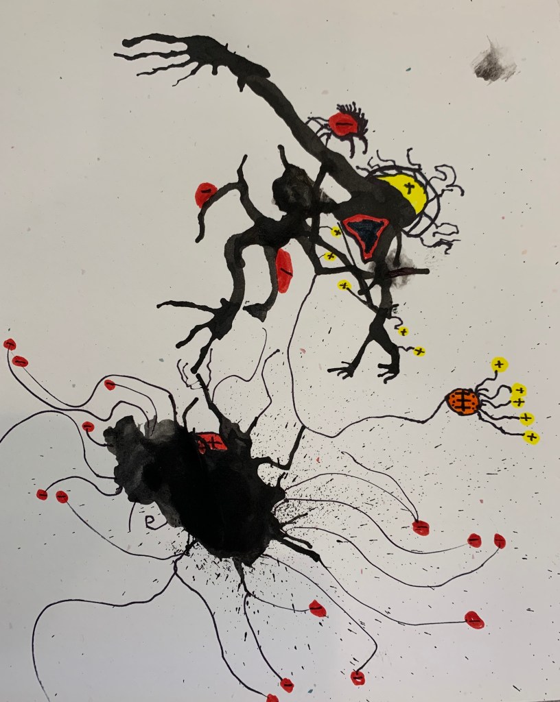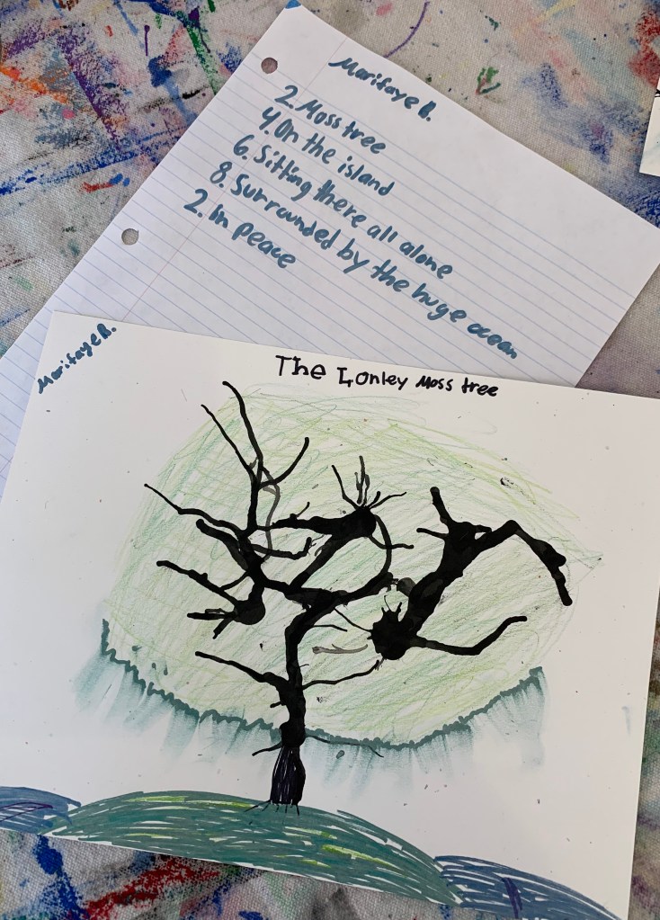 Denise Gallagher, a local author, illustrator, and graphic artist led the students in an abstract activity using small straws and India ink on paper. Enjoy the gallery of art. Some students wrote poems to accompany their creations.