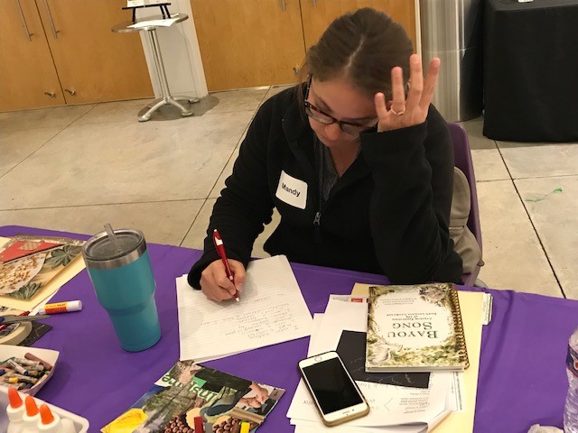 Then I led the teachers in writing their own poem by gathering new words from their own collages and selecting a form to use.  My hope is these teachers will take what they learned, their joy of playing with words and art, and bring it into their classrooms, but more than that, my poet’s heart was touched by the way my poems from Bayou Song led to more poems.