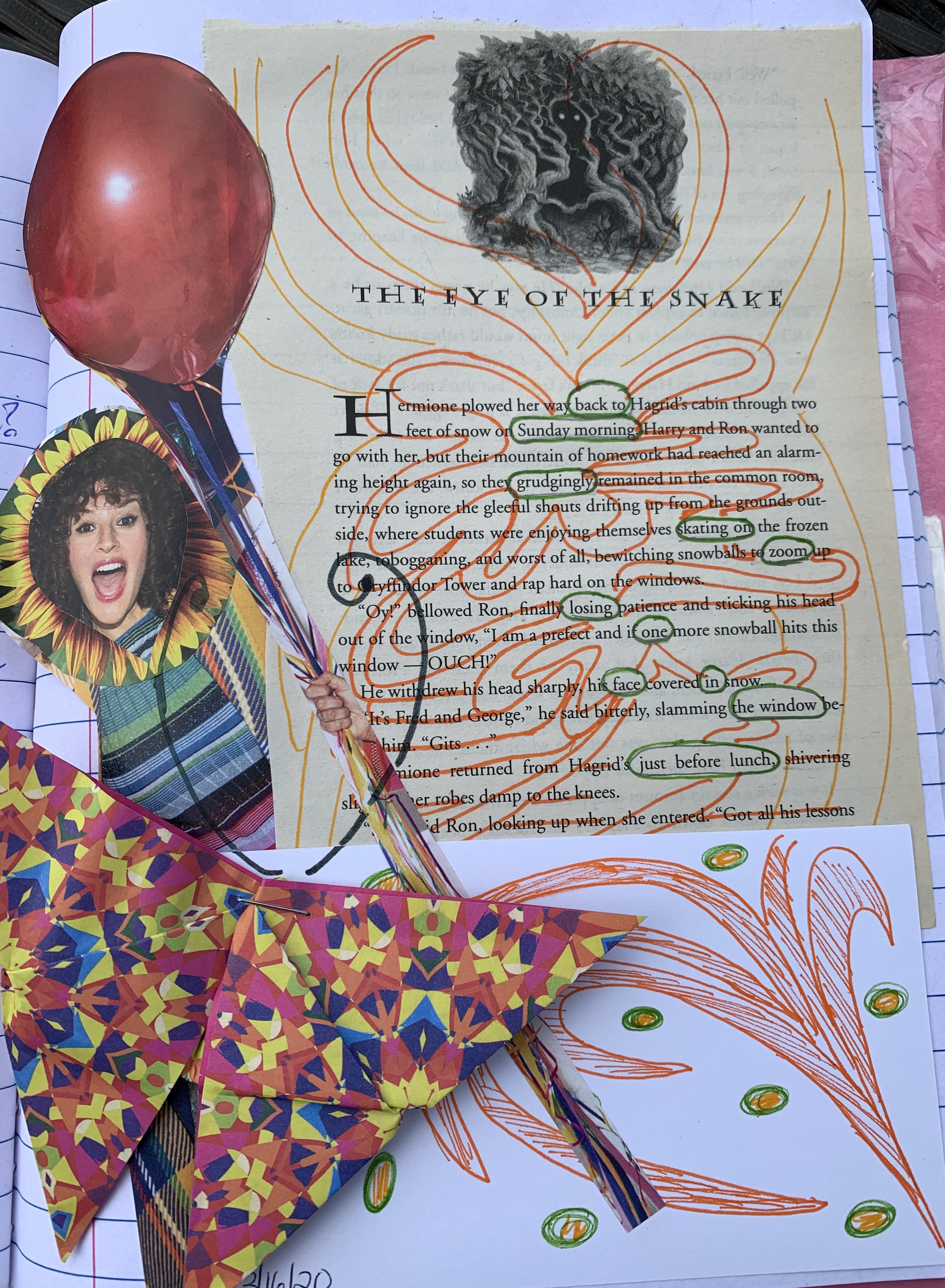 Playing with lots of creative ideas on this notebook page. I started with a falling apart copy of Harry Potter and the Order of the Phoenix. I wanted to try writing a blackout (erasure) poem that had nothing to do with the actual content on the page.