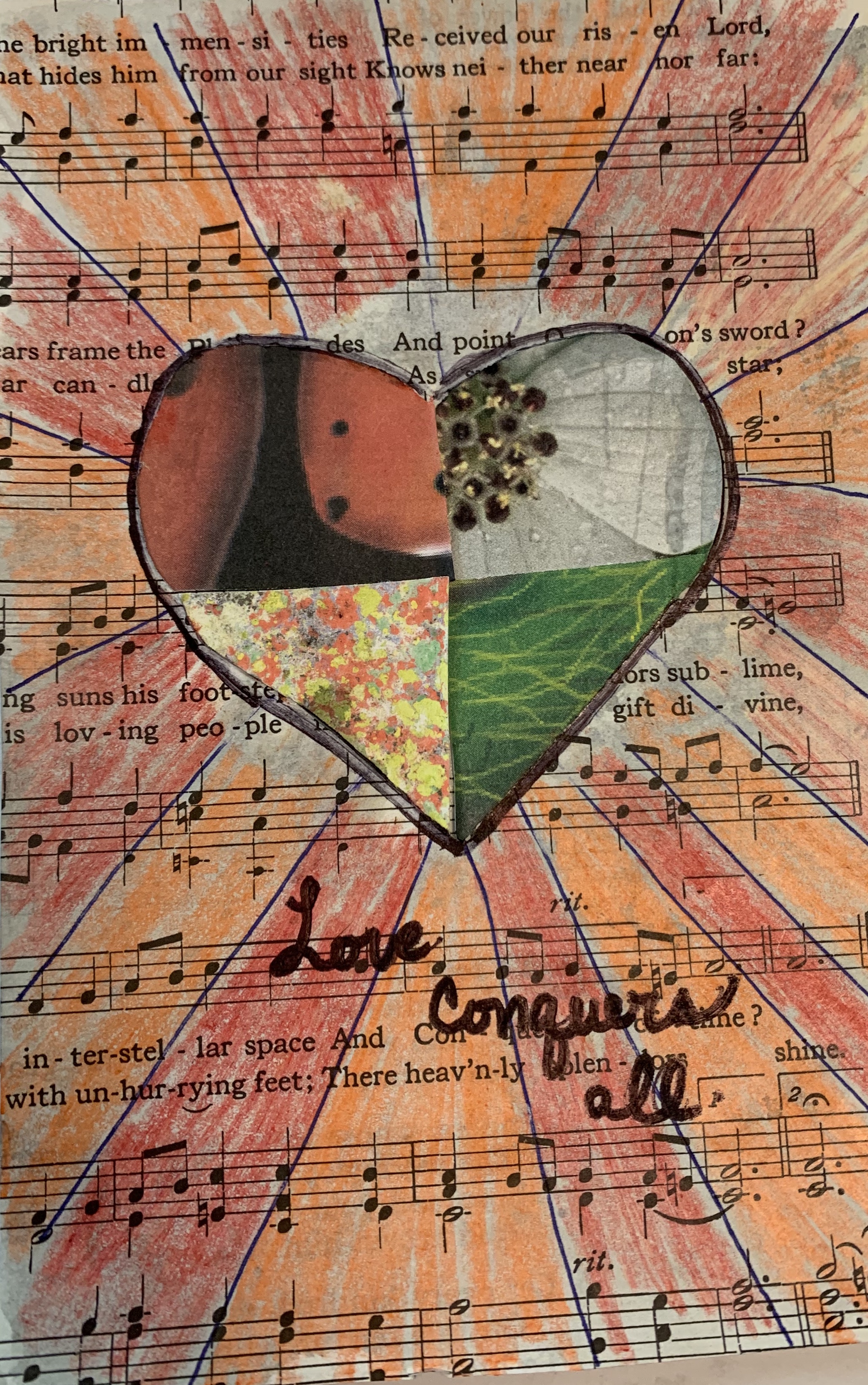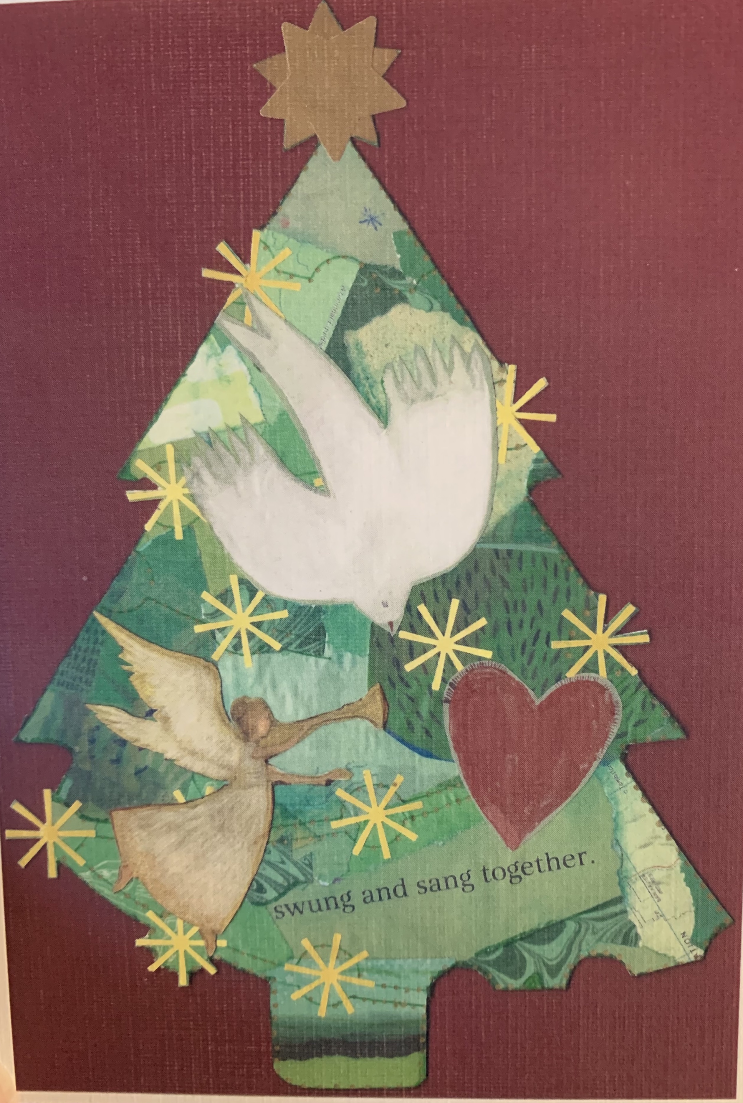 Art cards express a dedication of time and creativity. This year I received a beautiful collage art card from friend and fellow Inkling, Linda Mitchell. She says she “dabbles” but this card, and other work I’ve seen by her recently, are placing her into a higher artist category. She has talent, and I appreciate and admire her work.