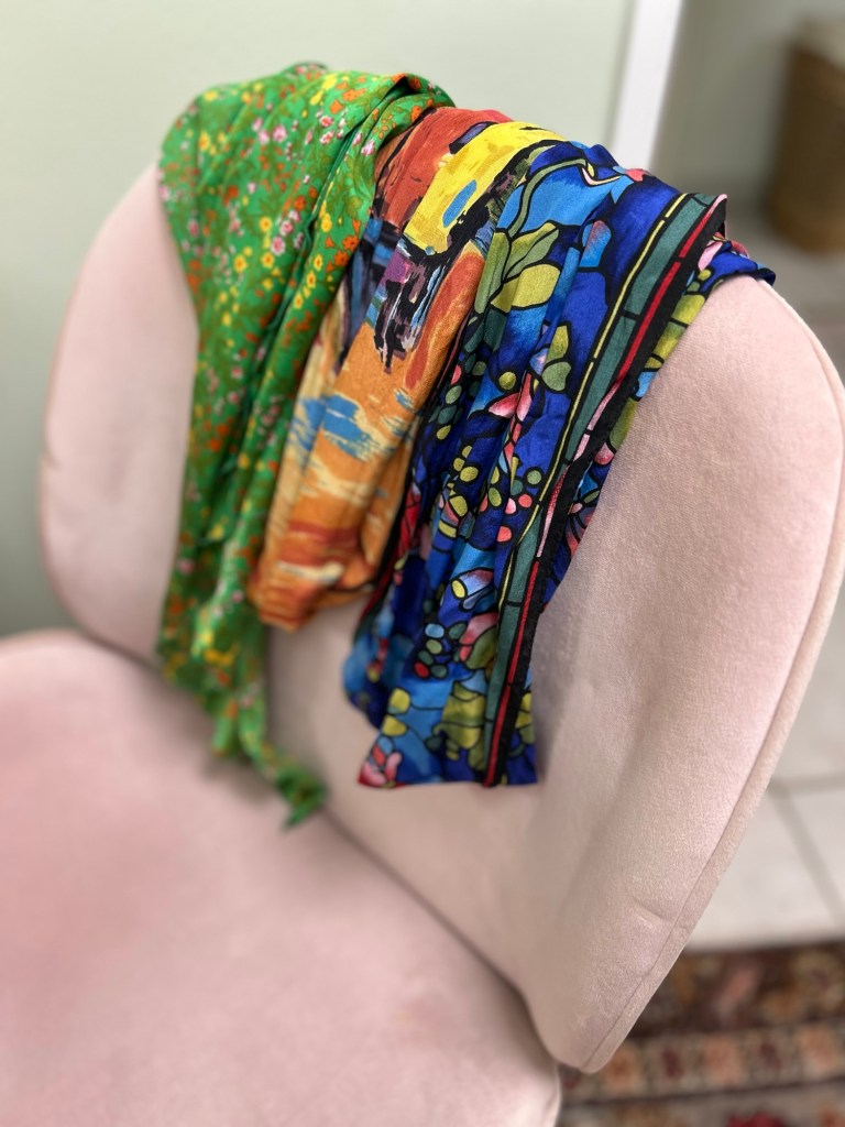 We worked quickly making choices to give away or throw away. Why? I asked myself did these scarves call to me?