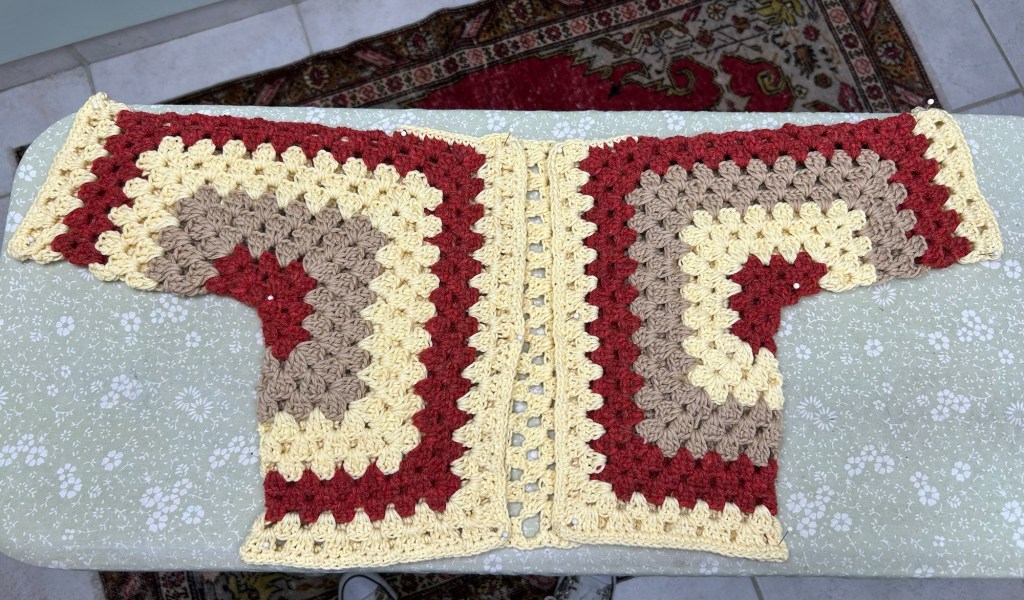 Two hexagon crocheted sweater blocked on the ironing board ready for steaming.