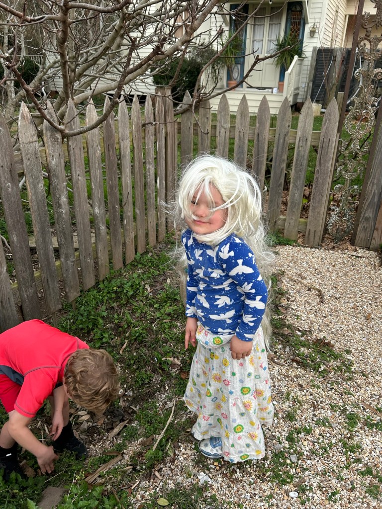 Stella ready to go the art show (pj top, dress as skirt, and Elsa wig)