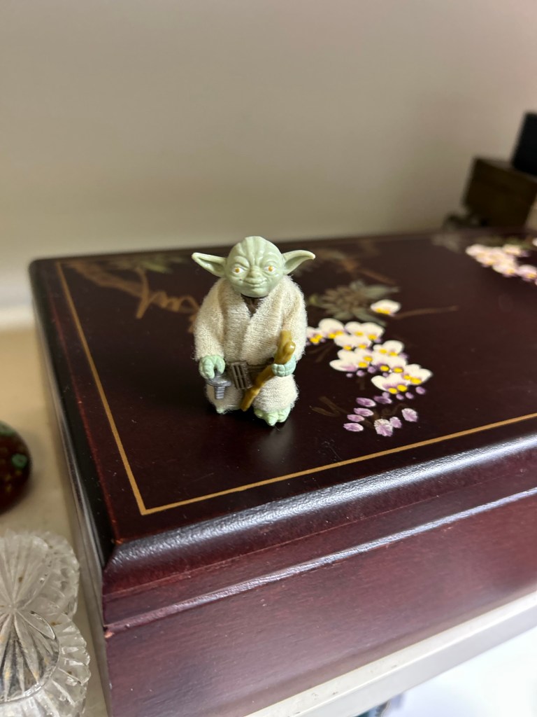 For some reason that I can’t ask him, my father had a little plastic Yoda on the shelf in his bathroom. It was obviously something he wanted to see every day. I took it home with me and it lives in my closet alongside my mother’s jewelry box. I wrote a poem about it.