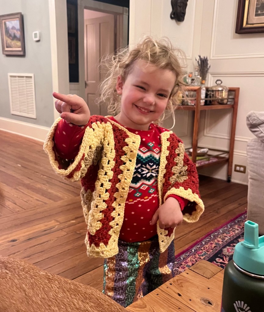 We were taking a driving trip with our family to Oklahoma right after Christmas, and I wanted a project to do on the drive and while relaxing at the house. I picked out three colors from my inherited boxes of yarn from my friend Marion who died in 2020. My daughter Maggie, the mother of Stella, said of the three colors, “Stella will wear that.”