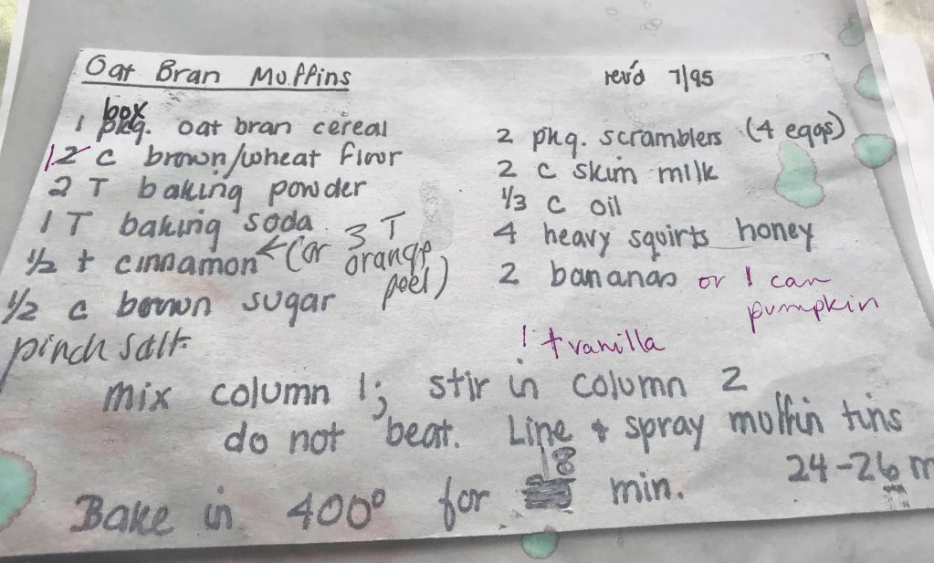 My mother made the dressing, the whole meal actually, but especially the dressing. Only Ballard cornbread mix would do, baked in a cast iron skillet to the perfect shade of brown. Sauté the trinity–onions, celery, bell pepper–in pure, smooth butter. Mix crumbled cornbread with vegetables, a sprinkle of sage, soak in chicken broth. I used vegetable broth instead the year I was vegan, but my children vetoed the change. Nostalgia for Dot’s dressing, an original recipe. Today I ask my mom if she remembers the recipe. She doesn’t. Whether evidence of memory loss or just the passage of time, I tell her,”It’s OK.” I open my recipe book, find the handwritten sheet of paper and begin, again.