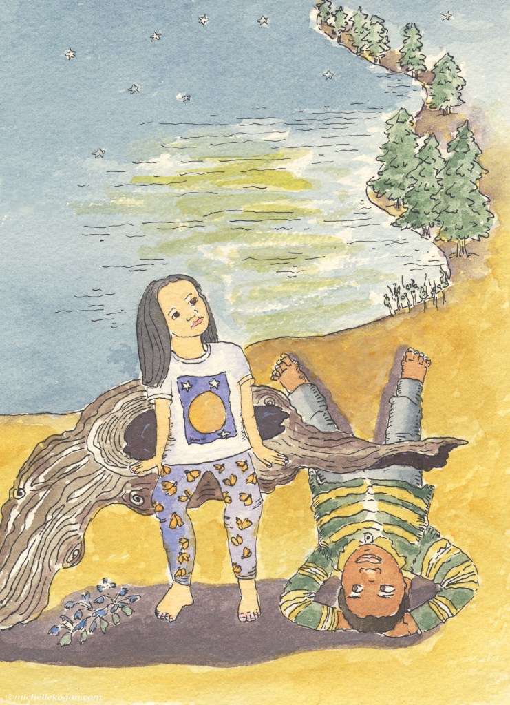 Let’s find pine needles, turn into vine knitters.We’ll lie on our backs and find shapes in the sky.
