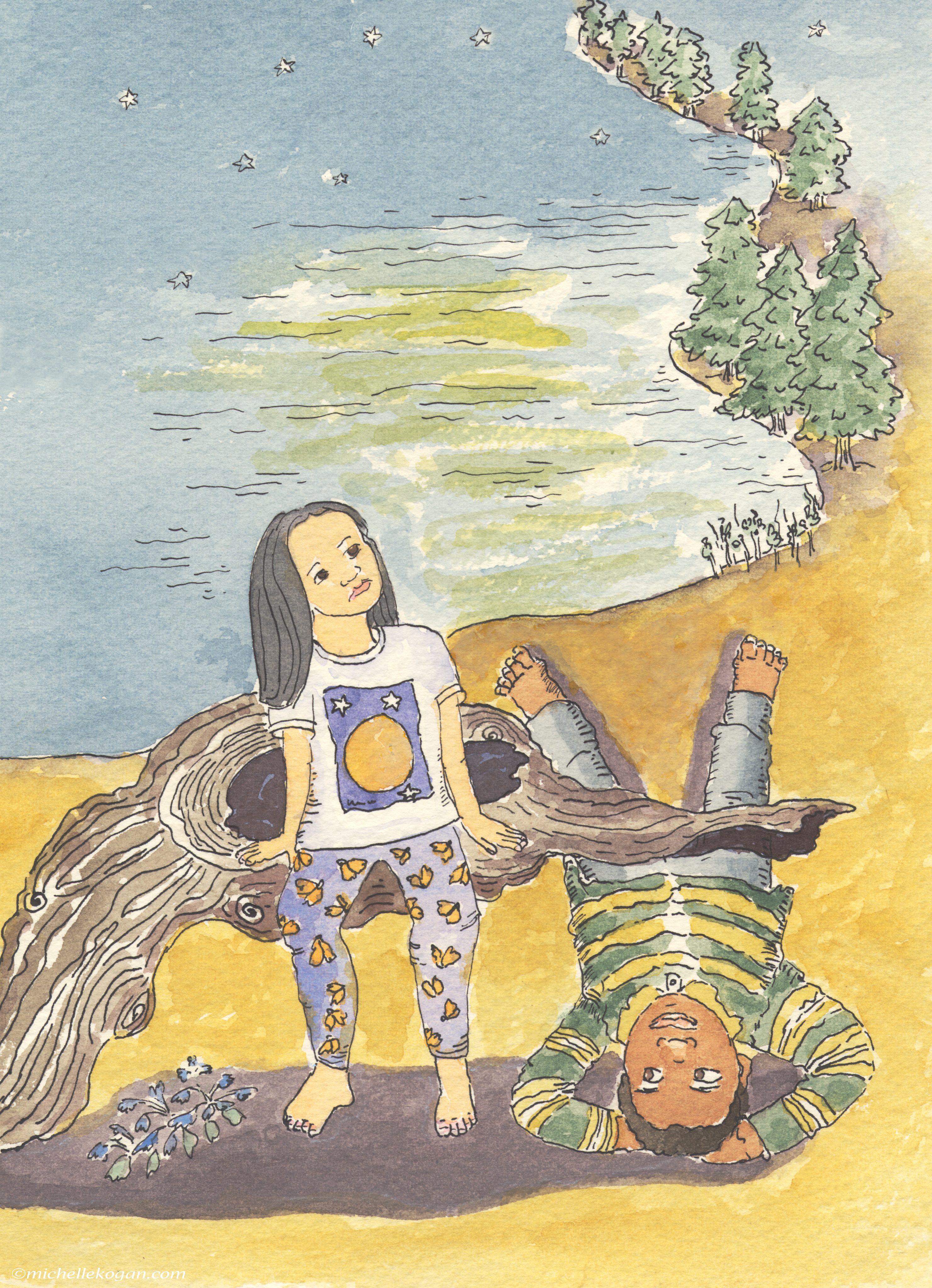 Let’s find pine needles, turn into vine knitters.We’ll lie on our backs and find shapes in the sky.