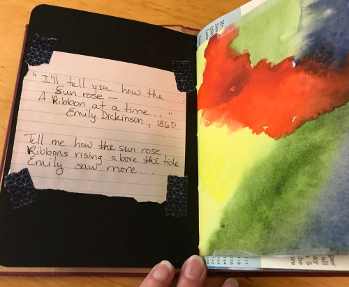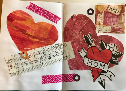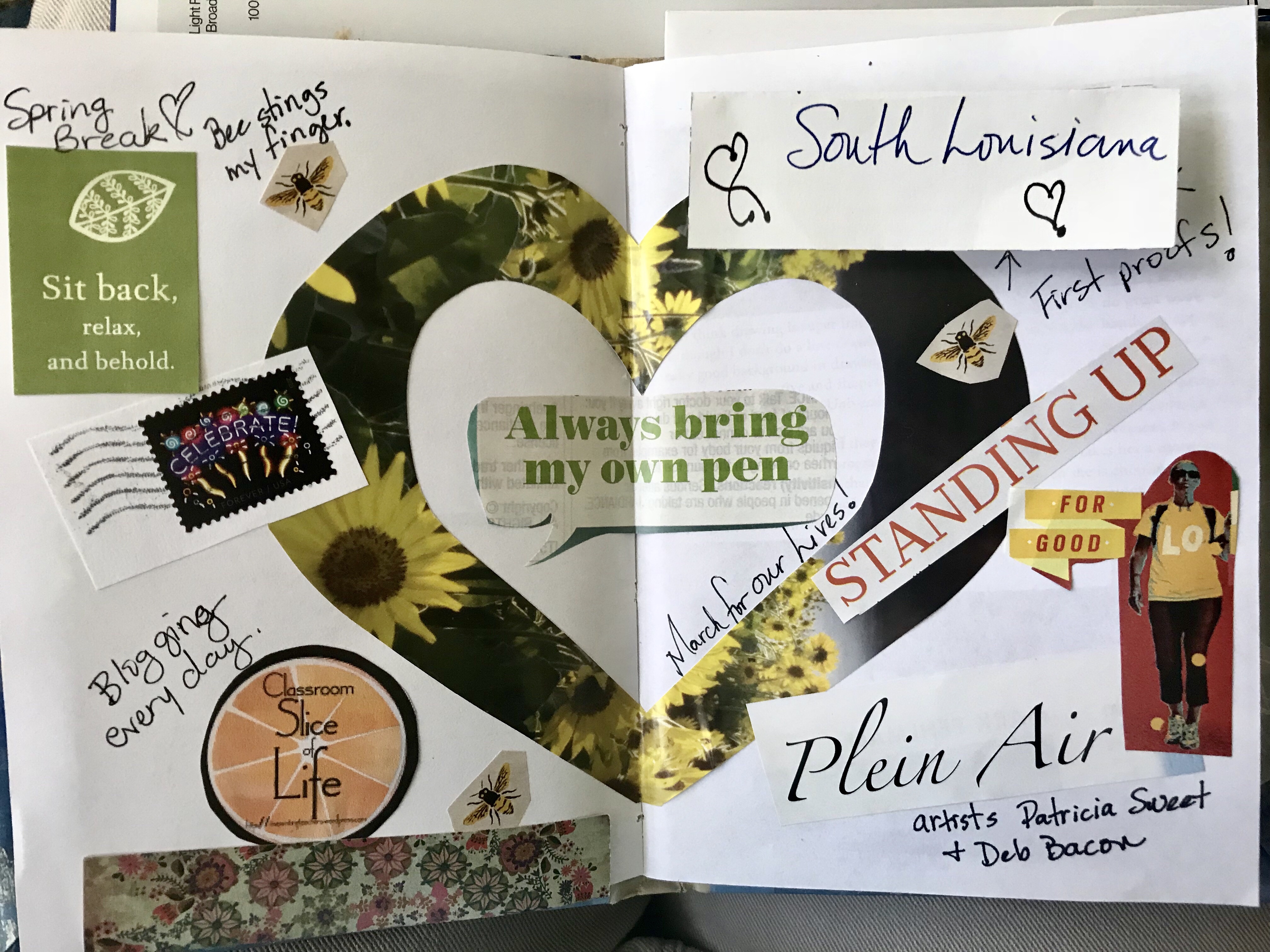 I filled the last page of my notebook, the one I use every day as I write alongside my students. We use marbleized composition books. With decorative paper, magazines, and other things, we collage covers for our notebooks. The last few days I have been stealing a few minutes here or there to work on my new notebook. Here are my completed covers. I tend to be pretty critical of my own collage work, but I like these.