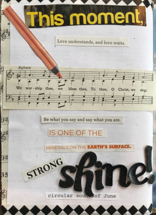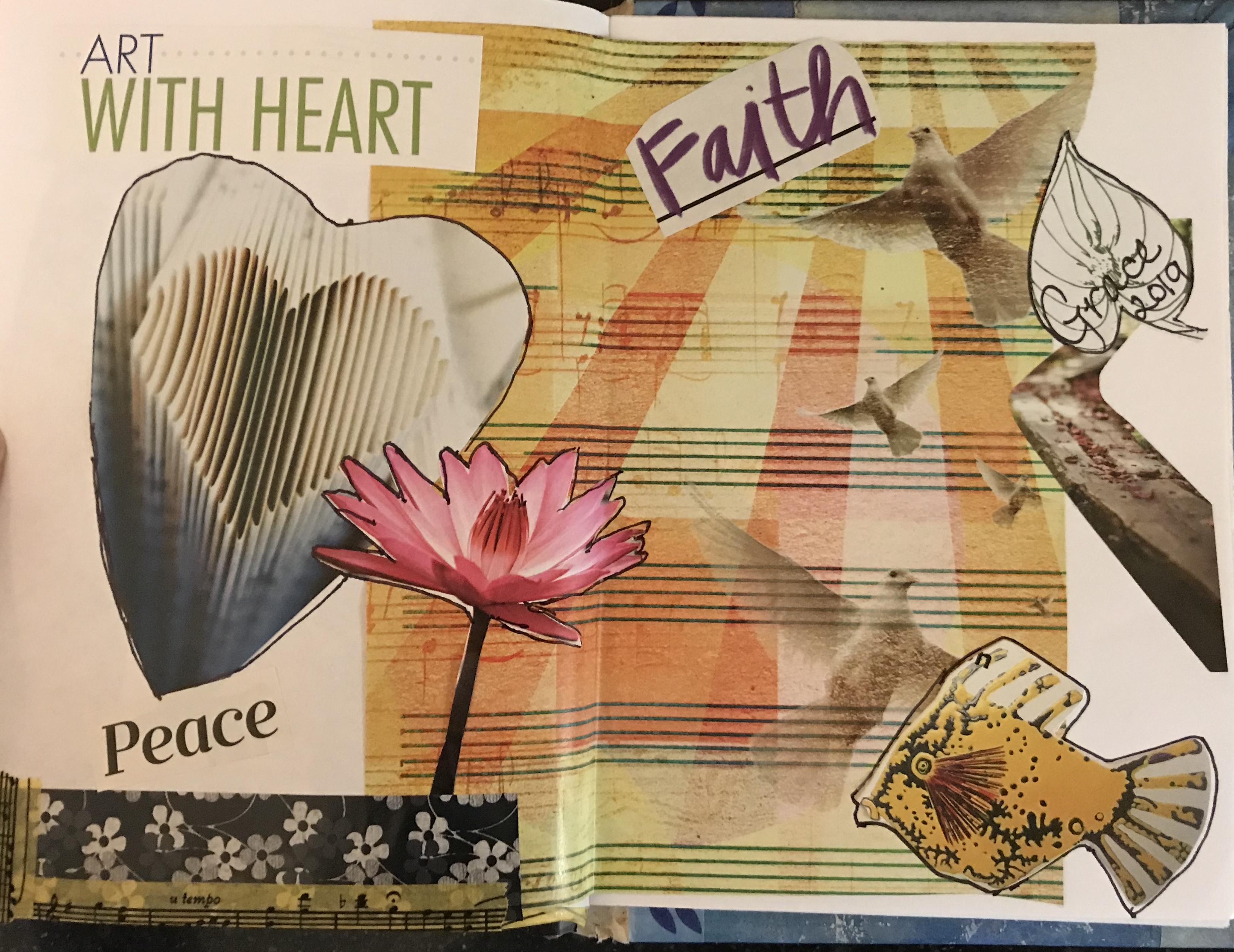 One of the elements on the front cover came from an ArtSpark postcard exchange with Jone MacCulloch and Amy Souza. I cut the quotes on the back from a 2021 calendar.