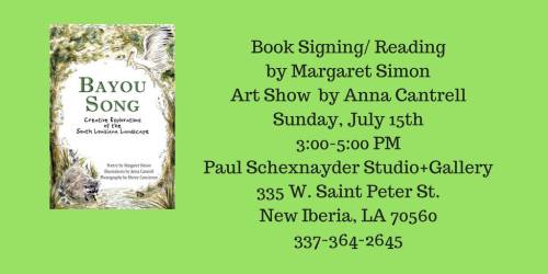 If you’d like a personalized copy of Bayou Song, I can mail it directly to you with payment using Paypal.  Email me at margaretsmn at gmail.
