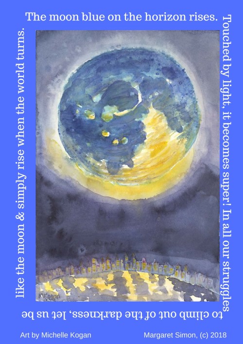 Every morning this week the full “blue” moon has accompanied me on my walk. I’ve taken cell phone photos that I posted on Instagram, but for this post, I reached out to my Inkling writing friend Molly Hogan. She came through with multiple moon photos for me to choose from.