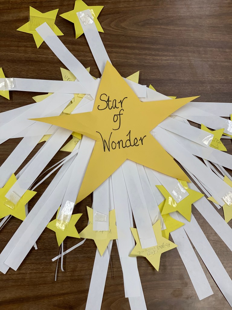 I took this question and created a door decoration for my classroom at Coteau (one of my two schools) inviting teachers and students to add a star. My student John-Robert presented the idea to his classmates, and they added stars to the door. On Friday, our last day before winter break, John-Robert gathered all the stars and create a found poem.