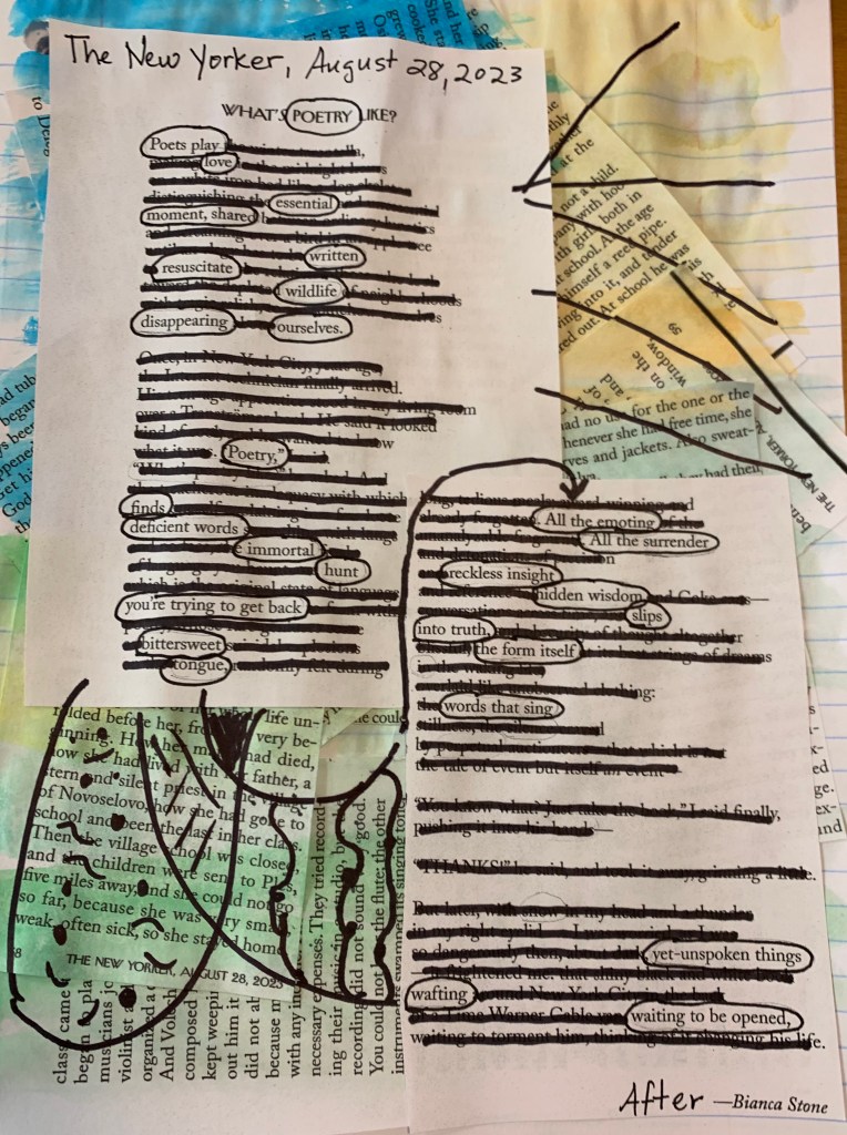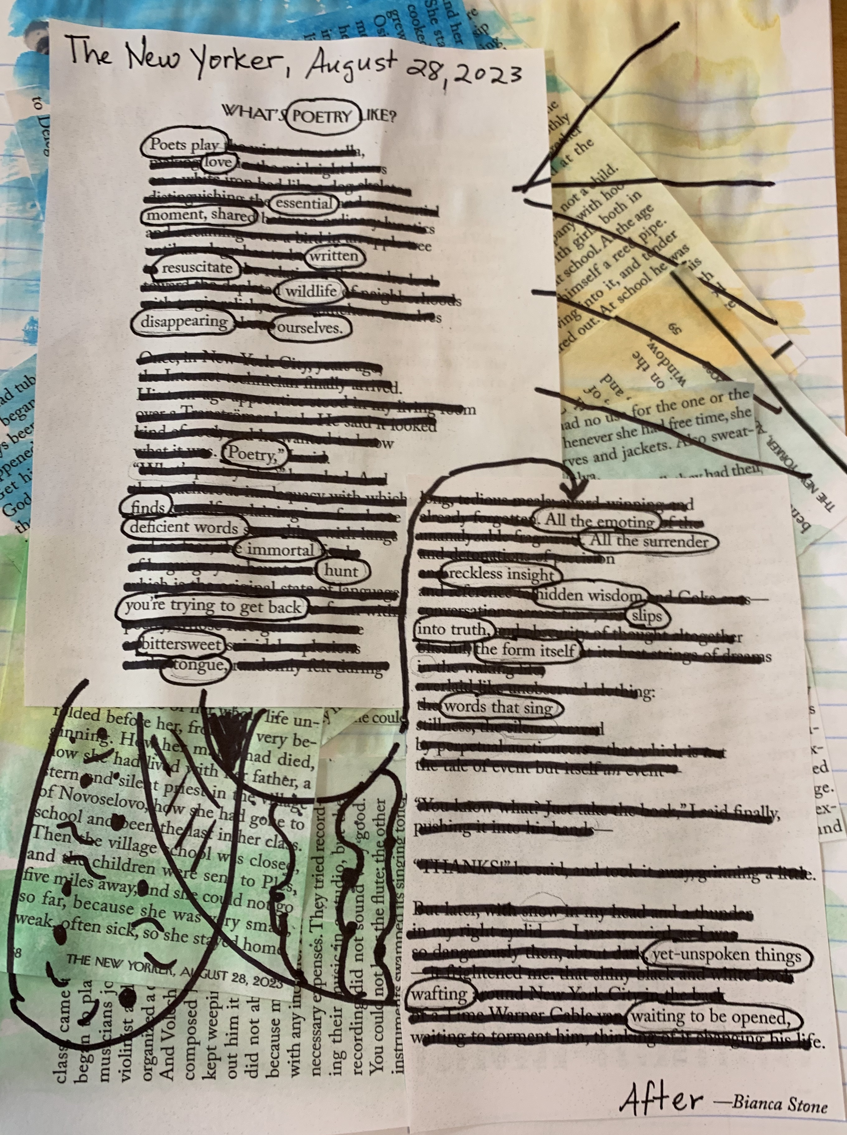 Creative endeavors are returning to me. It feels good and right. I recently read the poems in The New Yorker of August 28, 2023. The poem What’s Poetry Like? by Bianca Stone was popping out to me as a perfect erasure poem. I enjoy whittling down to essential words. I found another poem here with a slightly different meaning than hers. I hope she is the type of poet who knows the highest form of flattery is imitation.