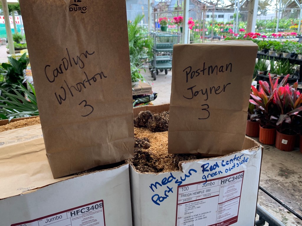 I am an impulse buyer when it comes to plants. I usually just go to the garden center and see what looks good. But Jenny had her list, had scouted Hebert’s to see what varieties they had, and pulled up the images on her phone. Good thing, too, because there is no way to know what you’re getting by looking at them. The boxes were big and full of wood shavings with bulbs buried deep inside. Each box was marked with the name of the variety, but what’s in a name like Postman Joyner or Carolyn Whorton? It was necessary to have a reference librarian like Jenny and her phone to know what we were buying.