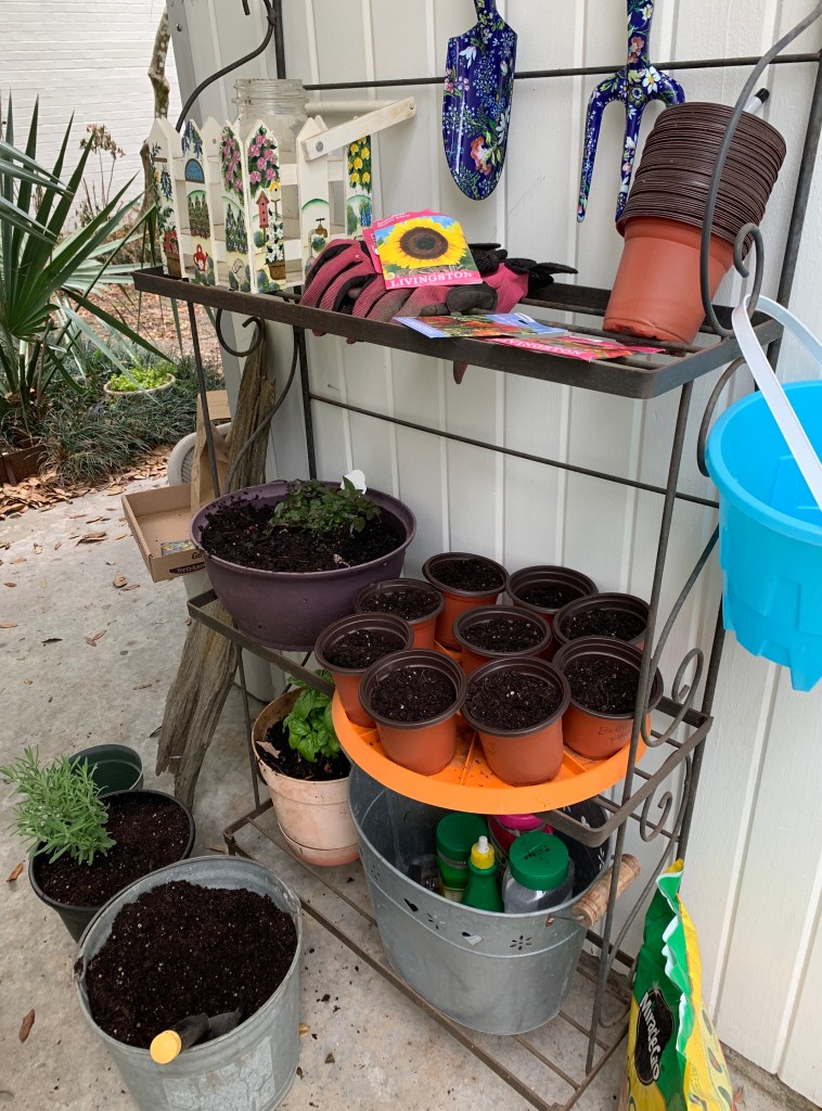 On returning home, I was inspired to make a potting station near my back door. It’s been an area of dumping, where I’ve thrown dying plants, extra pots, bags of dirt, etc. So I found an old wrought iron shelf in the shed and organized it with garden tools, pots of seeds, herbs, gloves, fertilizer. I am very pleased with this project and feel I am ready to be a gardener, a wish I’ve had for a long time. Finally nearing the age of 60, I’ve figured I can make happen what I desire to happen. It’s never too late. Why wait?