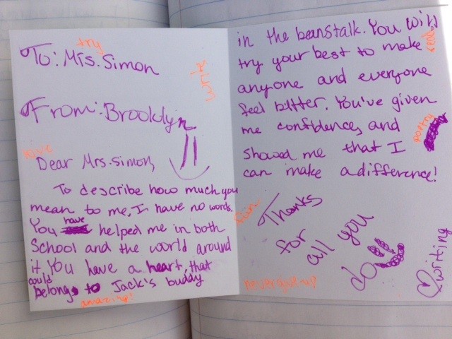 Gratitude #2: Last week was Teacher Appreciation Week. In addition to gifts of chocolate, lunch every day, and 5 extra lbs., I received this beautiful note. My favorite line is: “You’ve given me confidence, and showed me that I can make a difference.”