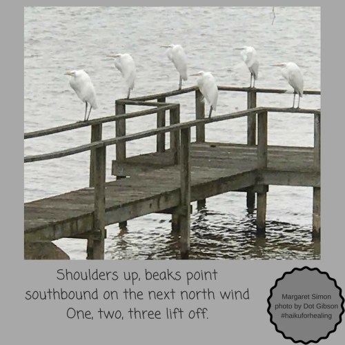 When I sit at my computer wondering what I may offer to the Poetry Friday community, I turn to nature. Nature is abundant here in my parents’ home on a lake in Mississippi.  My mother took a picture of six great egrets hanging out on the dock, hunkered against the cold wind.  Playing with the idea of a haiku-a-day from Mary Lee Hahn, I imagine that these egrets wished for warmer temperatures.