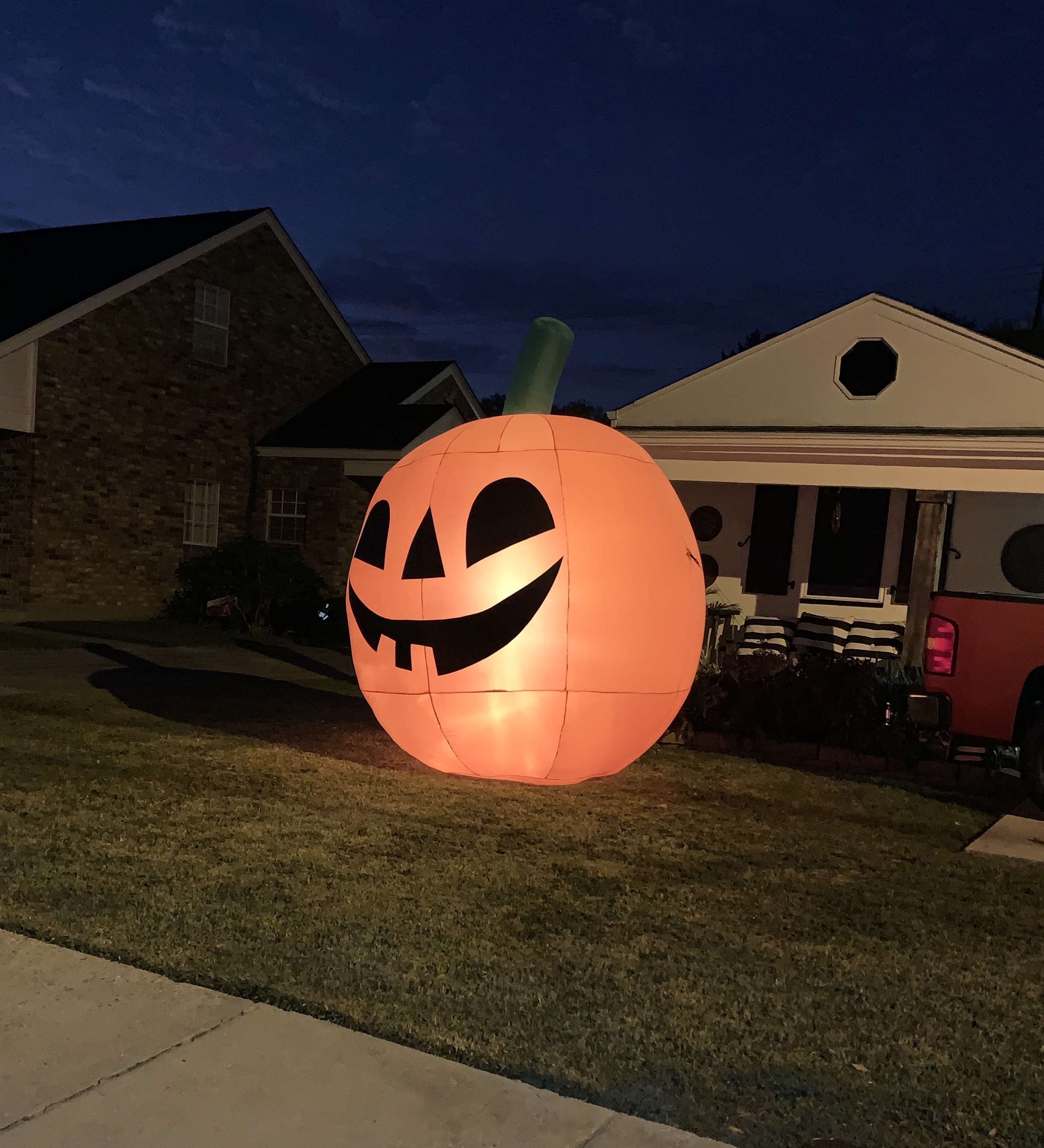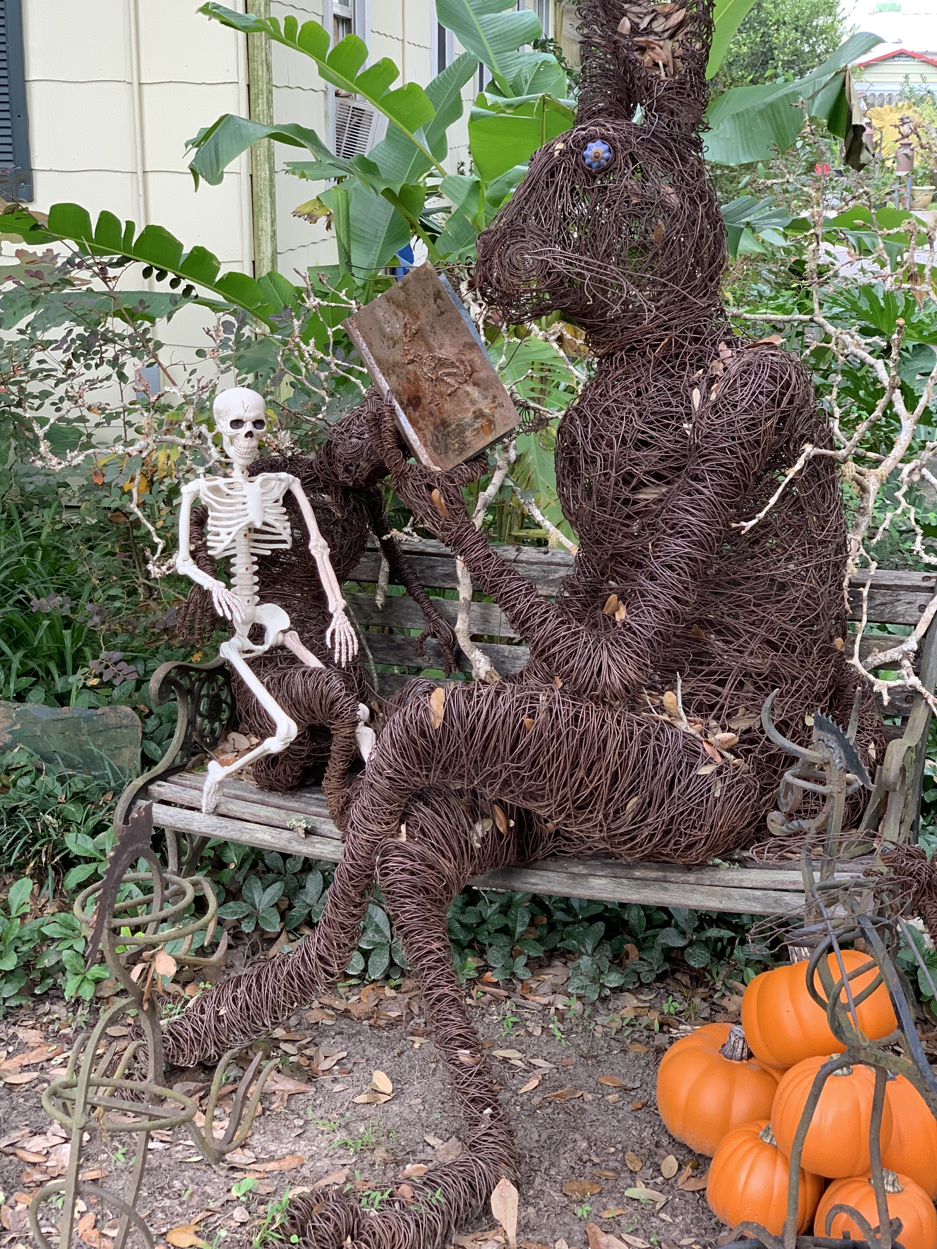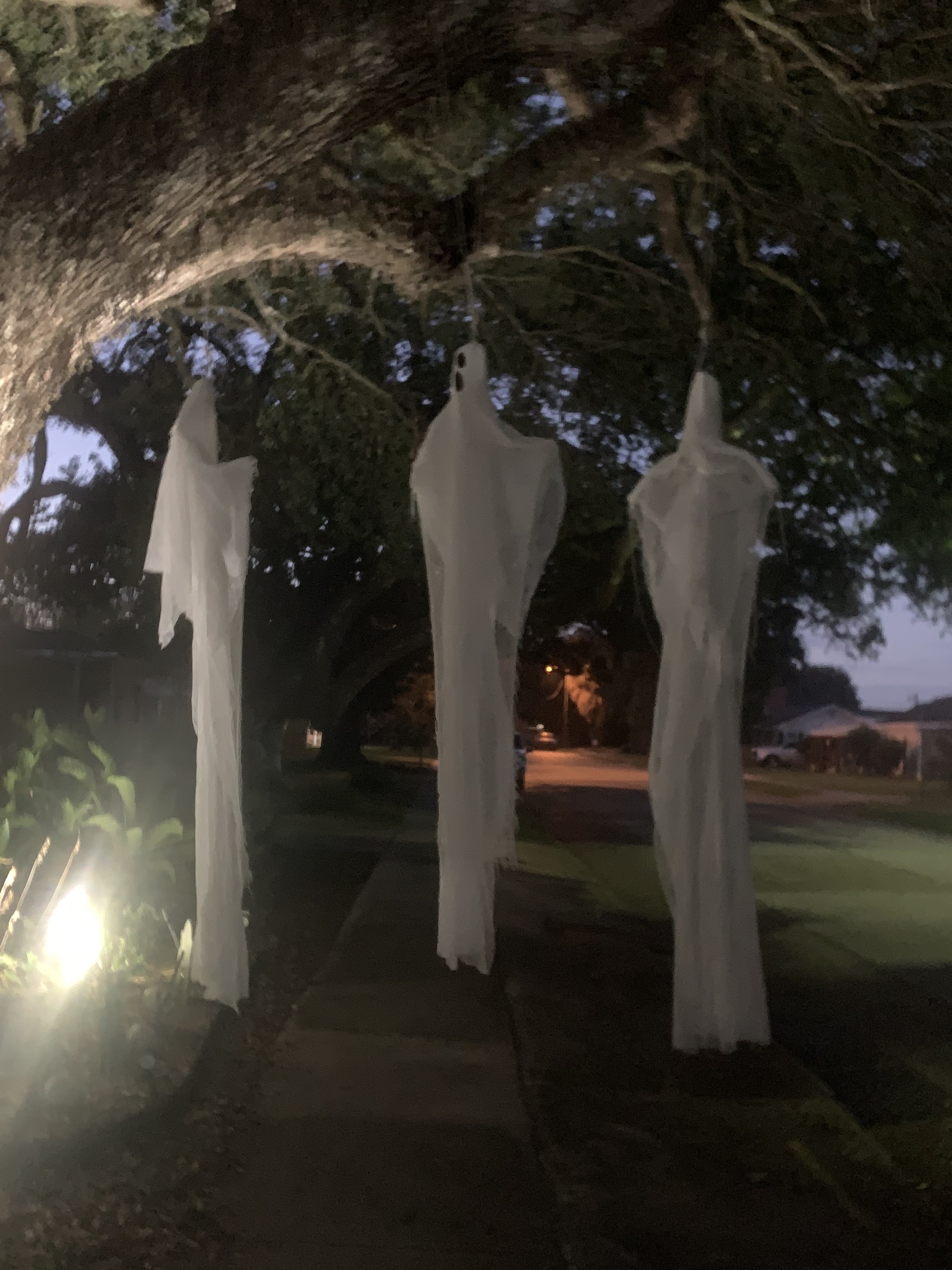 My neighbor’s ghosts are hanging around, over the sidewalk. On my early morning walk, I pass through them like passing through a curtain. The wind pulls them toward me, and I admit a little uneasiness. I saw Melissa in the store yesterday, and she grinned when she talked about them. She said, “I love my ghosts!”