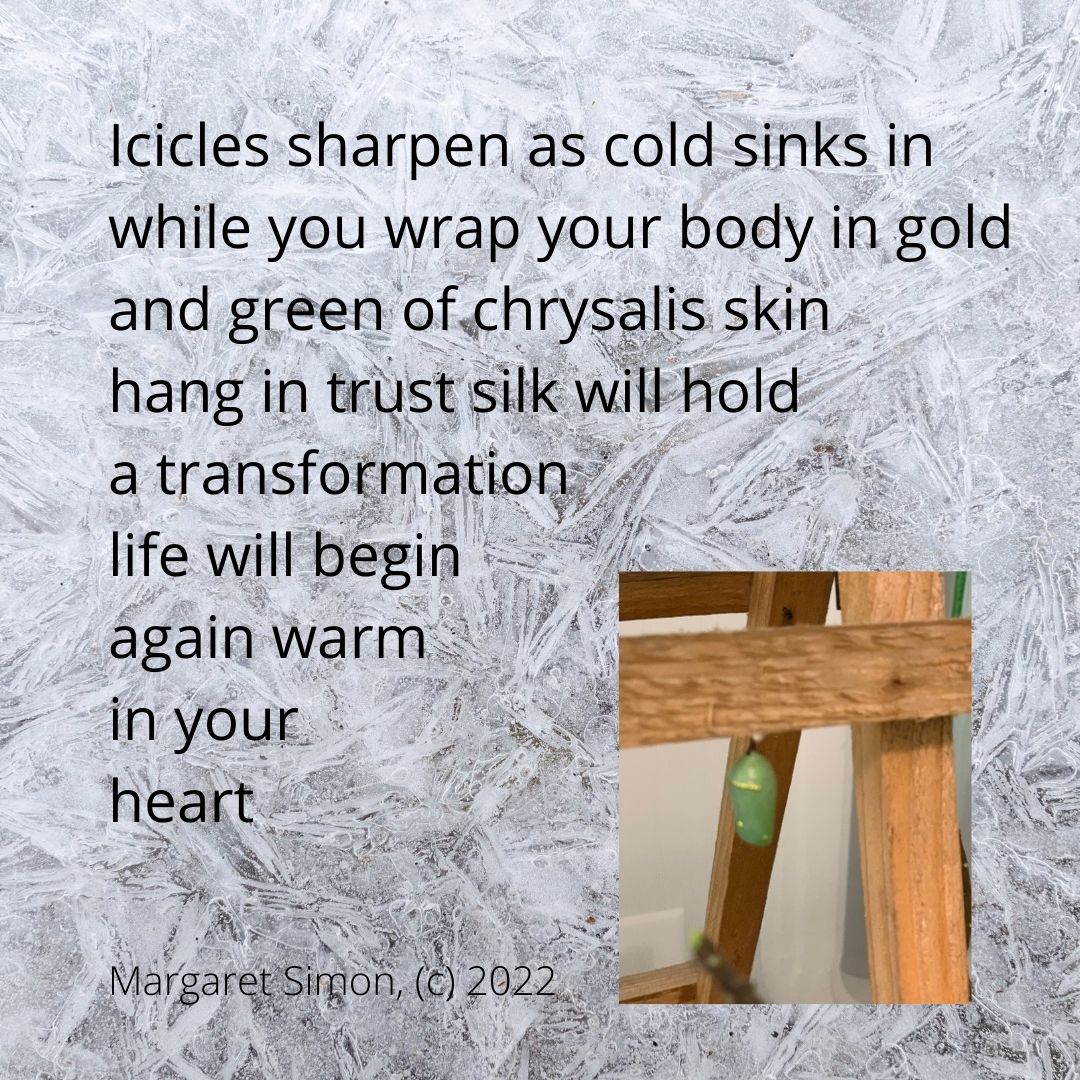 Inklings Challenge from Catherine this month: “Write a mathematical poem, such as a fib, pi poem, nonet, etc.” I forgot all about it, so this poem is a bit of a LaMiPoFri* poem. I wanted to try a nonet. I remembered Janet and Sylvia’s advice to write about what you know. I’ve been tending monarch caterpillars in my kitchen for weeks. There have been some losses, but today I am happy to report 9 healthy looking chrysalises and another caterpillar in J formation. I still have 4 free roaming caterpillars on very little milkweed and butternut squash.