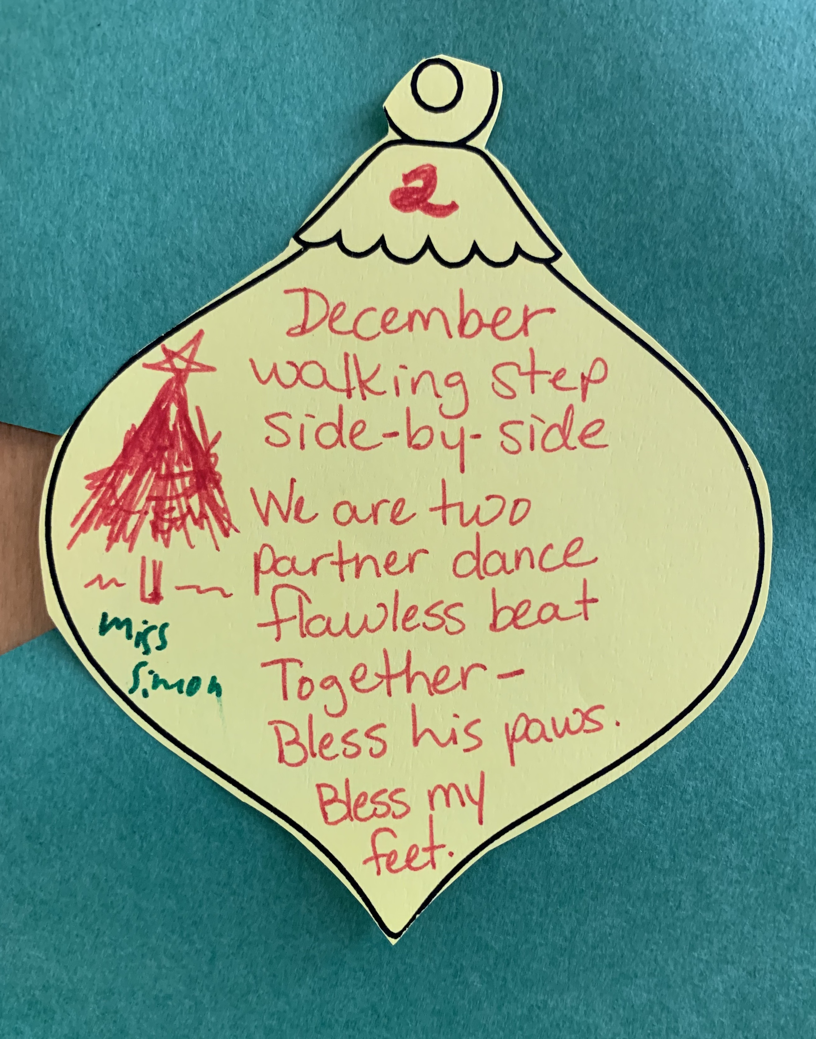 In my classroom, the gratitude poet-tree has been such a success that we decided to keep it going in December with a Christmas poet-tree. One of my students lost her beloved dog over the break, so I was thinking about how grateful I am for my walking companion Charlie. Charlie is 14 and has a heart murmur, but he still loves to go out for walks with me in the morning.