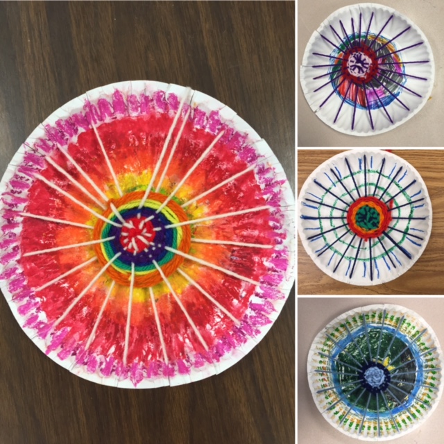 After we read and discussed the book, I invited my students to make a dot using this plan I found in Scholastic Teacher Magazine. The art teacher let us use her oil pastels. First we decorated the plate. Then we made 19 evenly spaced slits around the rim of the plate. (I used the bumps on the edges to help the kids know where to make the cuts, every third bump.) Then we threaded yarn around the plate to create a base for weaving. Most of my students had never weaved yarn before. They loved this new activity.