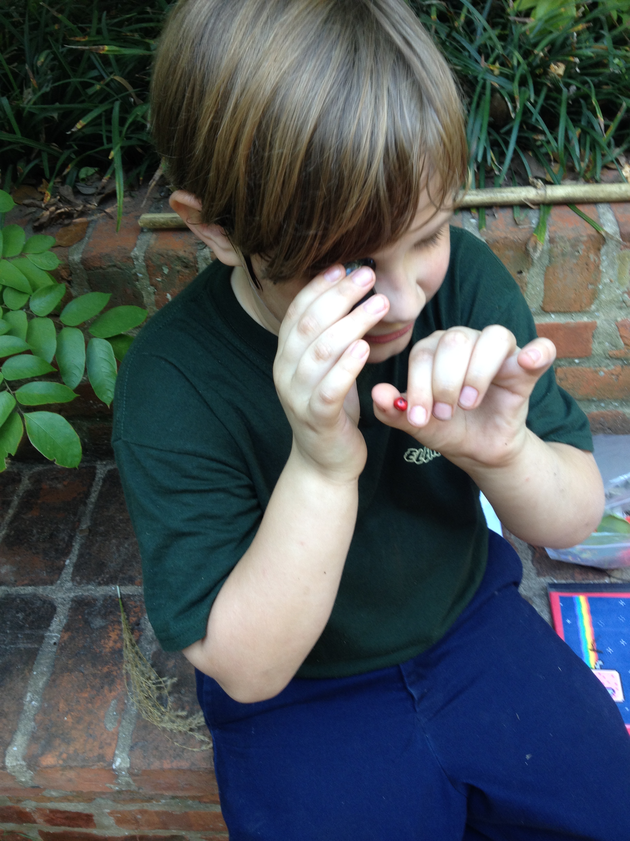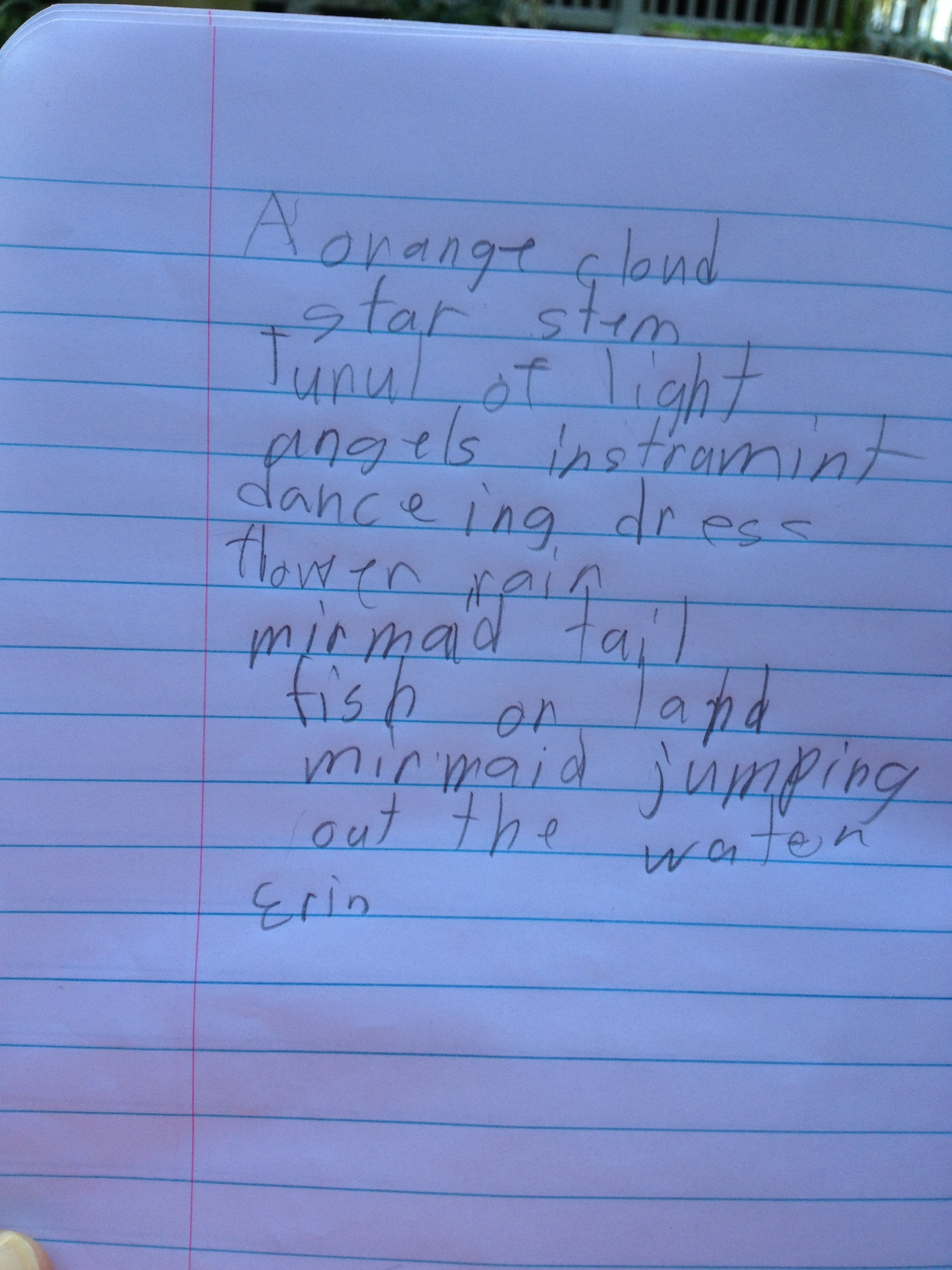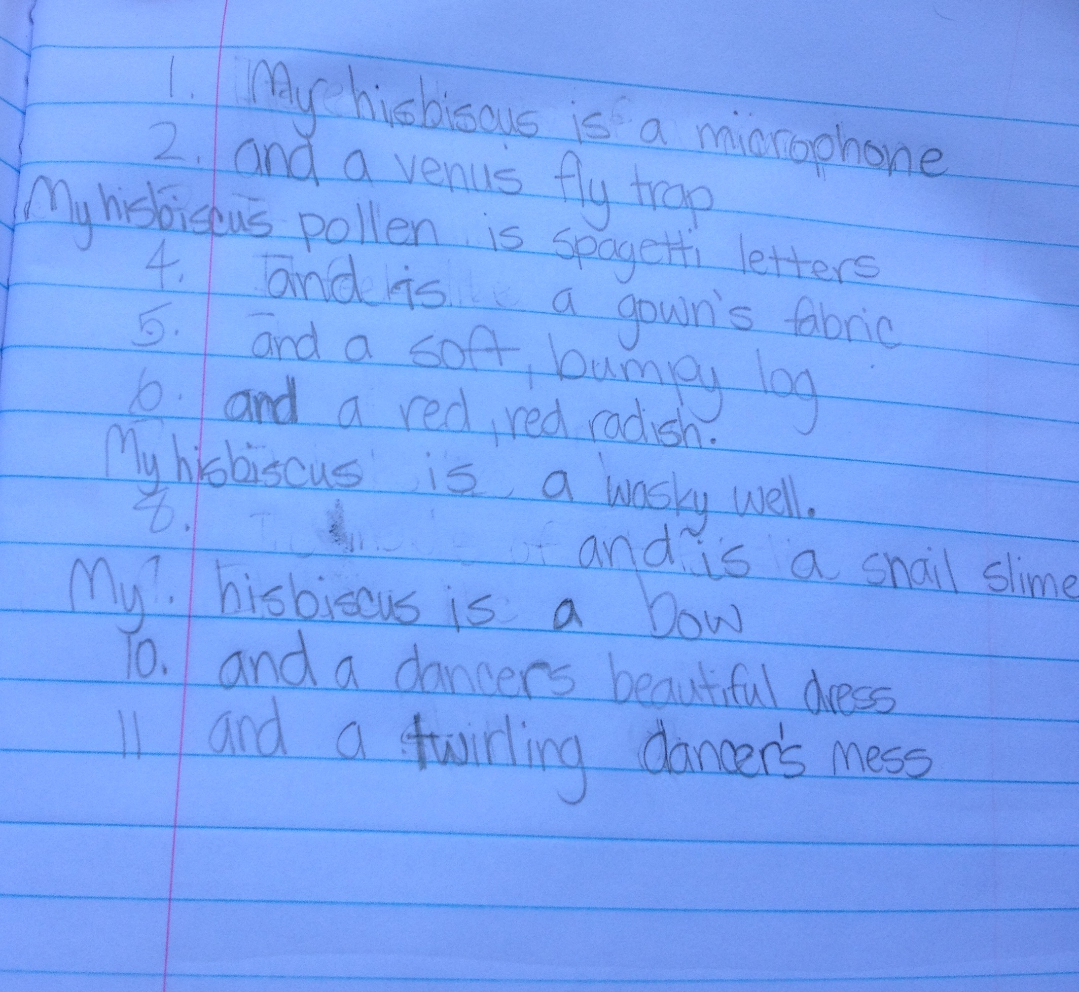 After collecting, I gave the students a Private Eye loupe magnifying glass. The exercise went like this: Look at your chosen object through the loupe and ask the question, “What does it look like? What else? What else?” In this manner, students were able to build a metaphor poem. This exercise worked well for my youngest writers. Here are a few.