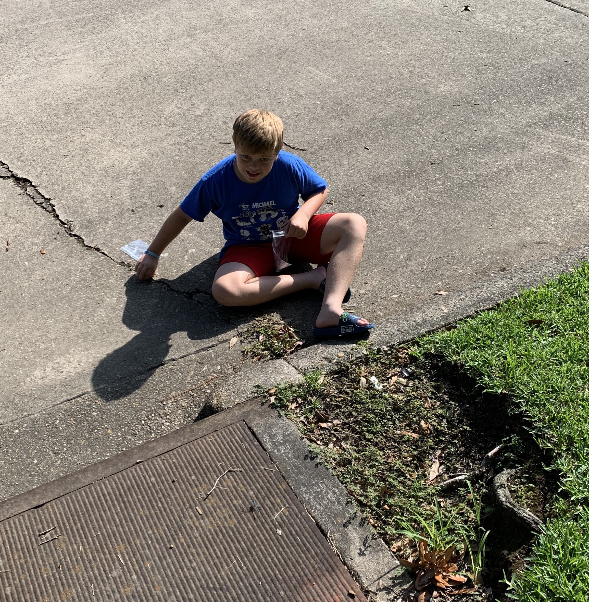 Yesterday I was walking and spotted a number of penny nails on the road. Perhaps some working crew had dropped them. I knew I couldn’t bend over for any length of time and pick them up, so I texted Jen and asked for one of her boys to come out with a ziplock bag. A simple act of citizenship turned into a math lesson for 9 year old James, a zine lesson for 5 year old Jerry (we wrote a story together), and an inspiring conversation with their young parents. God bless them. They are here from Indiana helping Jen’s mother cope with her father’s illness. Before my surgery, I took the three boys to a splash pad for some summer fun. After, they showed up at my door with fresh picked cucumber and a cake James made “by himself.”