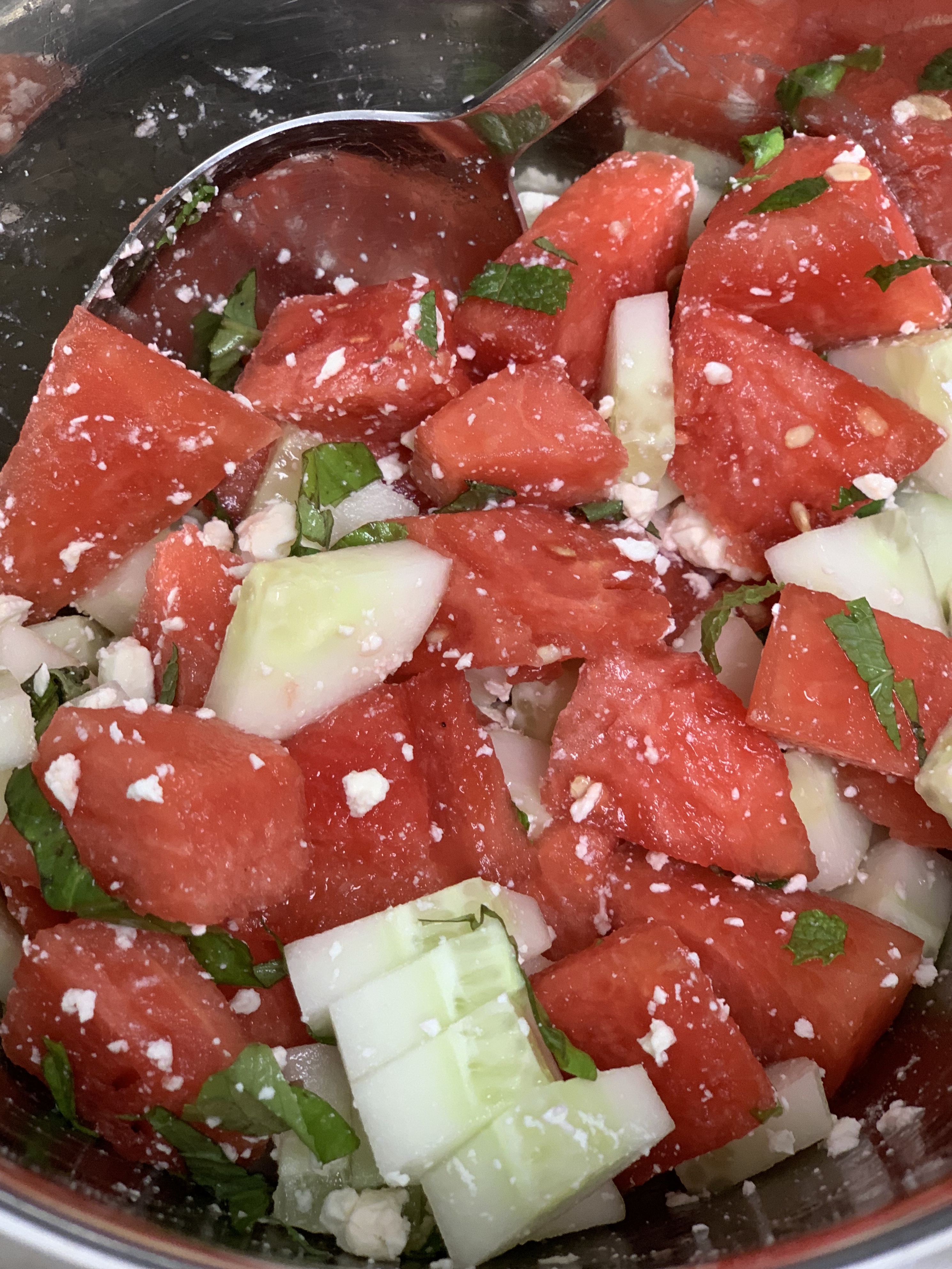 With another cucumber from the neighbor’s garden, my husband suggested a watermelon and cucumber salad with dinner. I haven’t been eating much, but this idea made my mouth water. I texted another neighbor, Ric, to see if he had some basil and mint in his wife’s garden. In the late afternoon, I took another walk (figuring out that two walks a day are better than one for my recovery) and stopped at Ric’s. I came home with basil, mint, parsley, and some left over tabouli that another neighbor had made for Ric.