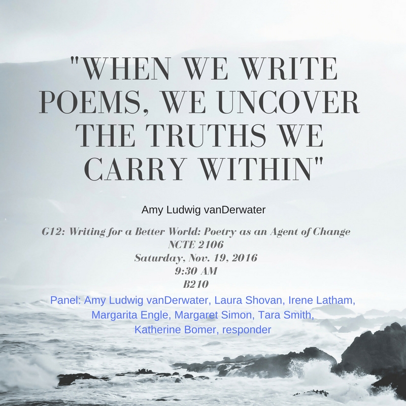 I will be presenting with Irene and some other awesome poets at NCTE 2016 in Atlanta:Sat., 9:30 G.12 Writing for a Better World: Poetry Response to World Events B210