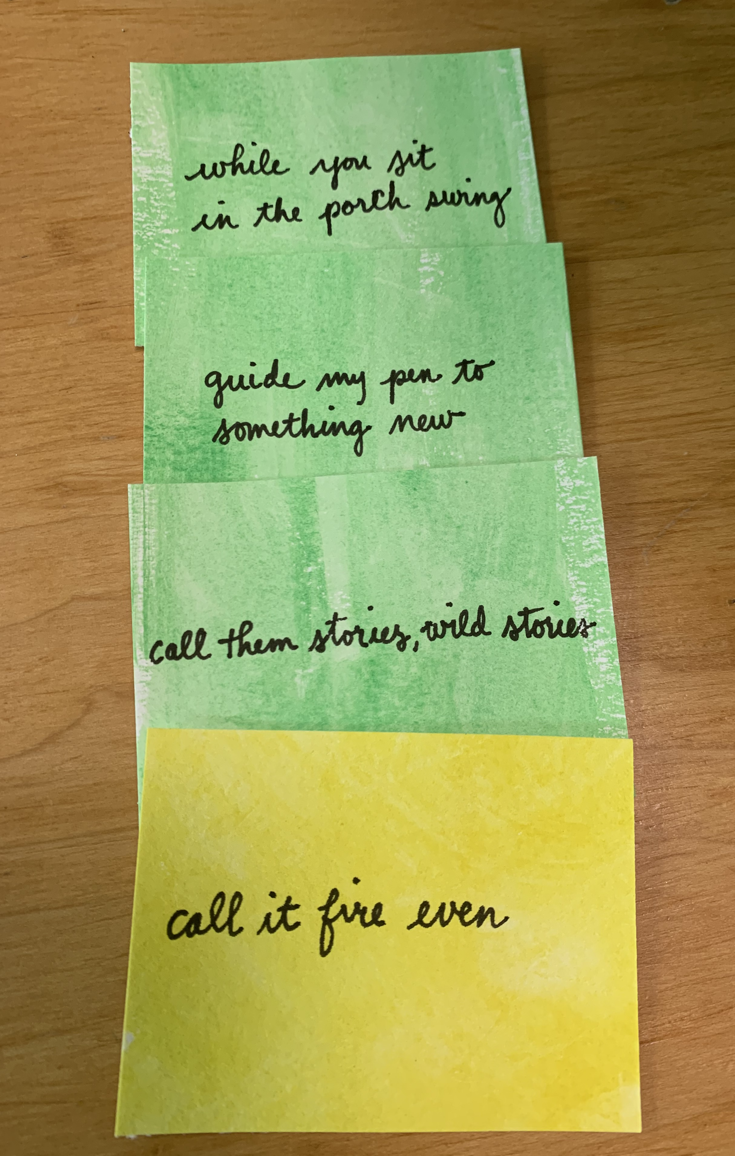 Earlier in the summer I received a poem swap from Mary Lee Hahn. She made an oracle deck from my own words, phrases she had found in my poems. She color-coded the cards to show which was 5 syllables and 7 syllables. Then she created two poems from my words, a haiku and a doditsu (7-7-7-5). She encouraged me to make these with my students this year. Tucking it away until April when we’ve written lots of poems together from which to choose lines.