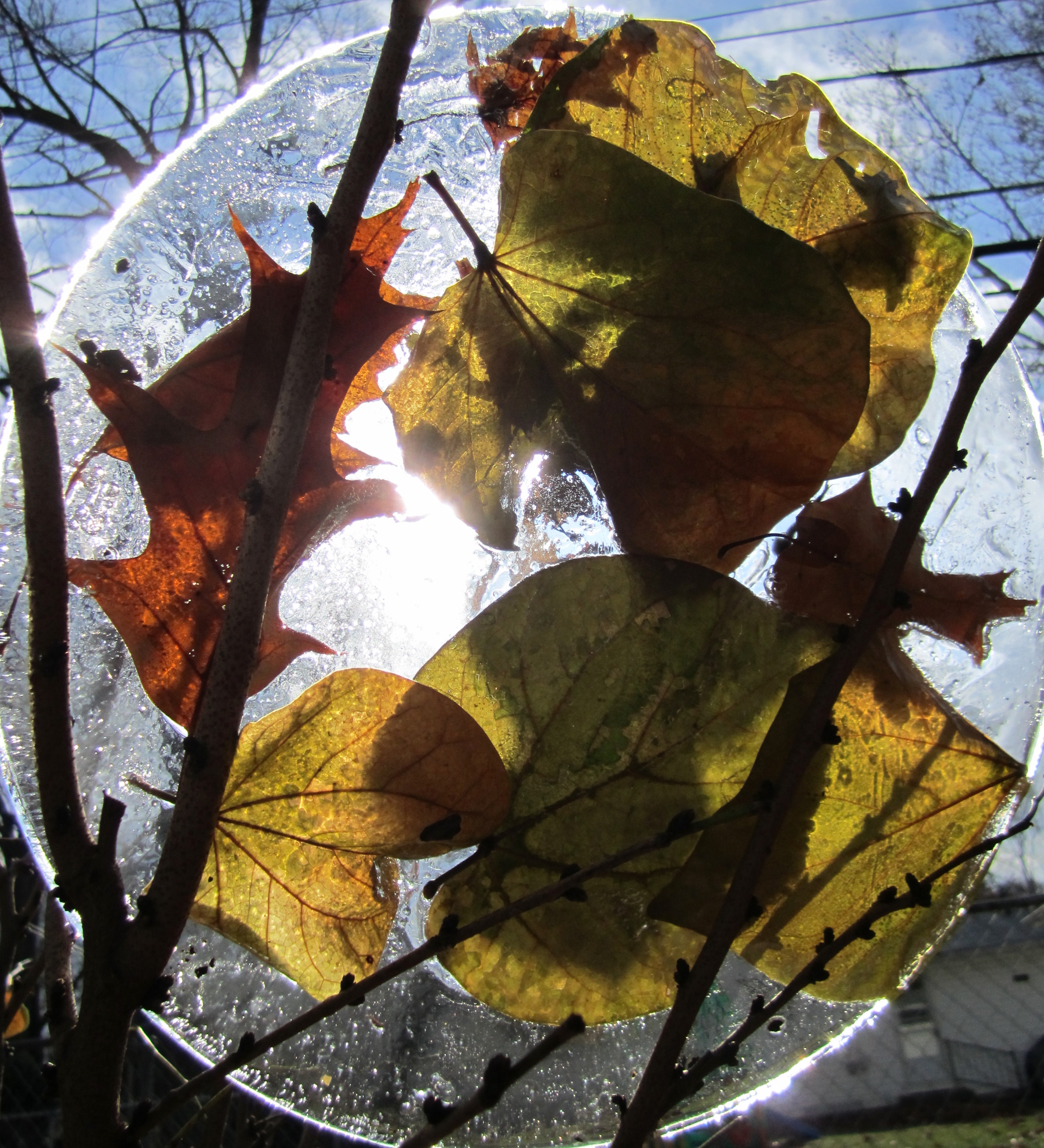 Mary Lee wrote Riches about a photograph. She told us that the bird bath had frozen over with a myriad of leaves in it. Her husband removed the slab of ice and placed it in the sun, and she photograph it. The play of light in the ice attracted her eye and her poetic self.