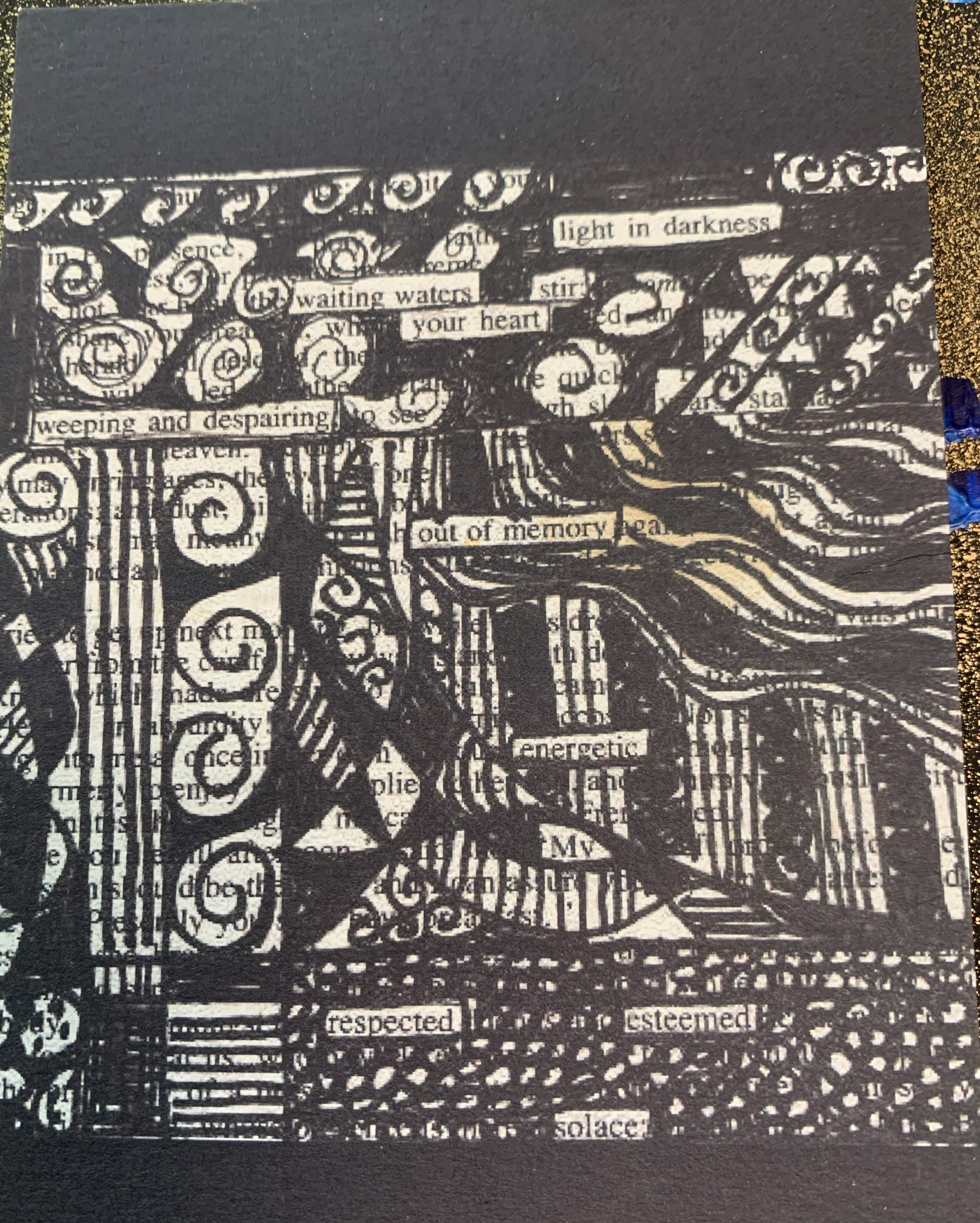 I have done zentangle before but I’ve never been satisfied with the results. I got a card in the mail from Jone MacCulloch along with a plaque print of her amazing collage response for our Spark exchange. Jone’s card inspired me to try again with a mentor to emulate.