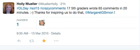 My students are slicing away. Friday was Digital Learning Day. Our activity was a crazy comment challenge. I offered candy prizes for comments. (Skittles for single comments and Dum Dums for 10) Two students wrote 50 and got a treat from the lounge. I offered the challenge on Twitter and Holly Mueller’s class took it on.