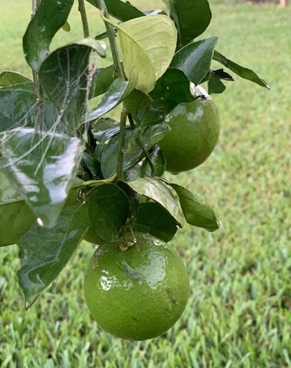 I try to get outside early in the morning for a walk, often before the sun rises. On my path is a grove of fruit trees. I watch these trees as the season slowly changes to fall. Trees seem to know even before we can feel the air temperature change that fall is on its way. I know the slant of light changes and all that, but I just wish for a little cooler breeze. My husband always says that satsumas (oranges) ripen around the time of the first report card. I wrote a modern haiku in honor of the wet green fruit. Please take a moment to write a small poem in the comments and support other writers.