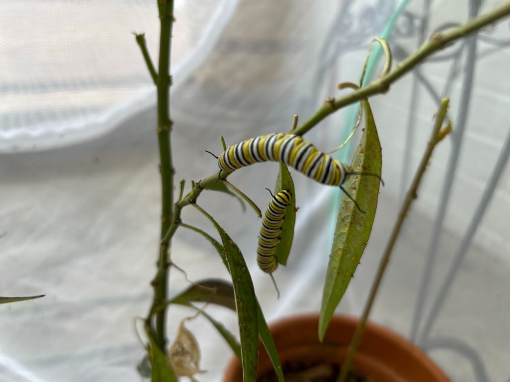In the spring, I found monarch caterpillars on the swamp milkweed. A few weeks ago I found two tiny ones on the tropical milkweed. Because of all the predators (lizards, birds, etc.), I decided to put the two babies in an enclosure. What I thought was two became 6 very healthy caterpillars munching away on both varieties. I was hoping I could keep them fed for the growth period.