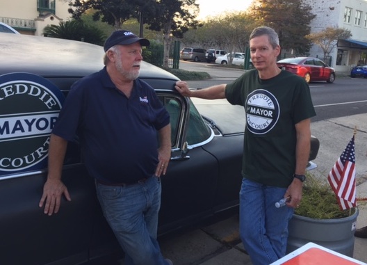 These days the presidential election campaign is heating up (or gone off the deep end, rather), but in our small town of New Iberia, politics happens on Main Street. My husband will not discuss national politics, but he can talk all day with his friend Dan who is running for Mayor Pro-Tem. Here they are at a political rally complete with signs, beer, jambalaya, and a brass band.